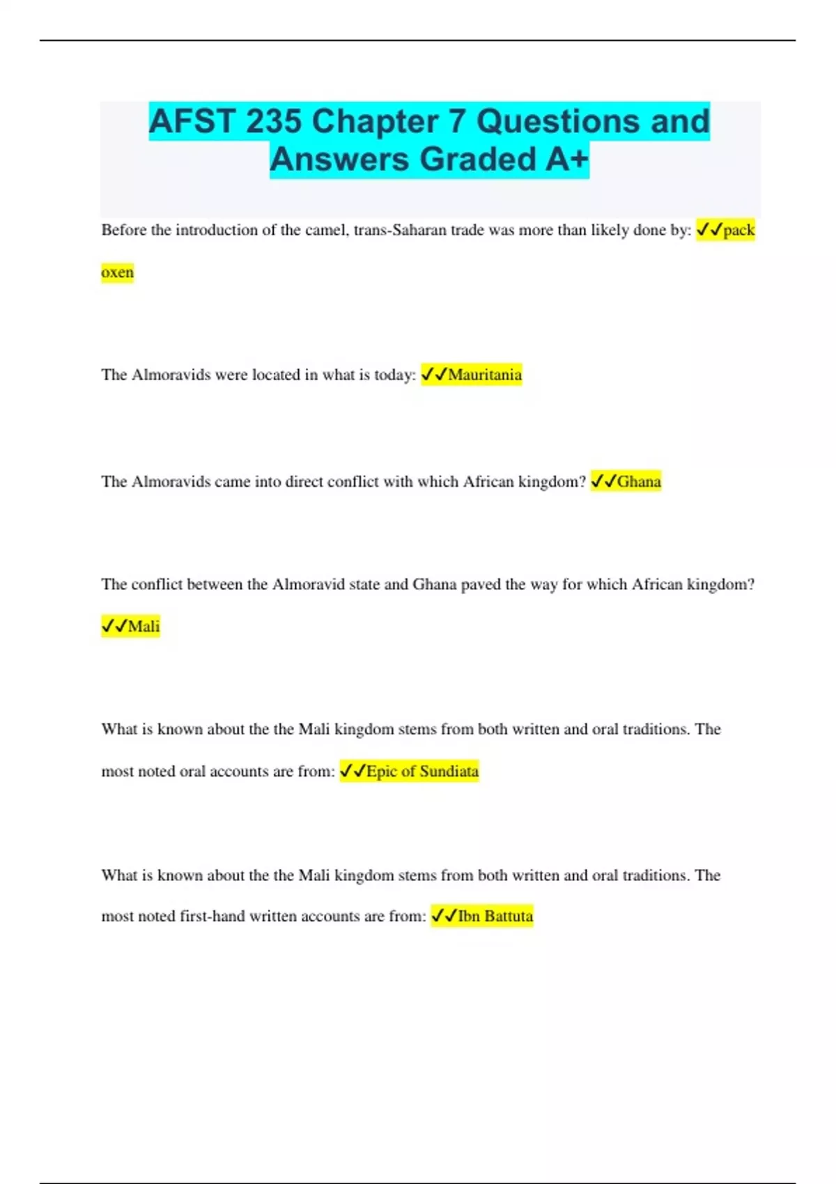 AFST 235 Chapter 7 Questions and Answers Graded A+ Before the introduction of the camel, trans-Saharan trade was more than likely done by: pack oxen The Almoravids were located in what is today: Mauritania The Almoravids came into direct conflict with which African kingdom? Ghana The conflict between the Almoravid state and Ghana paved the way for which African kingdom? Mali What is known about the the Mali kingdom stems from both written and oral traditions. The most noted oral accounts are from: Epic of Sundiata What is known about the the Mali kingdom stems from both written and oral traditions. The most noted first-hand written accounts are from: Ibn Battuta In the Mali empire, the mansa was not considered a divine ruler. True The wealthiest man in African history was: Mansa Musa The founder of the Songhay dynasty was: Sunni Ali The Songhay empire reached its height under: Askia Muhammad North African Clans berbers- had subgroups Soninke traditional African tribe, started Ghana Who took over Ghana? Soso When did Mali empire begin when Soniata took ever Why did Mali decline? ineffective rulers, invaders, Songhai Ruler of Songhai Sunni Ali Who did the Songhai empire reach its height to Askia Muhammad