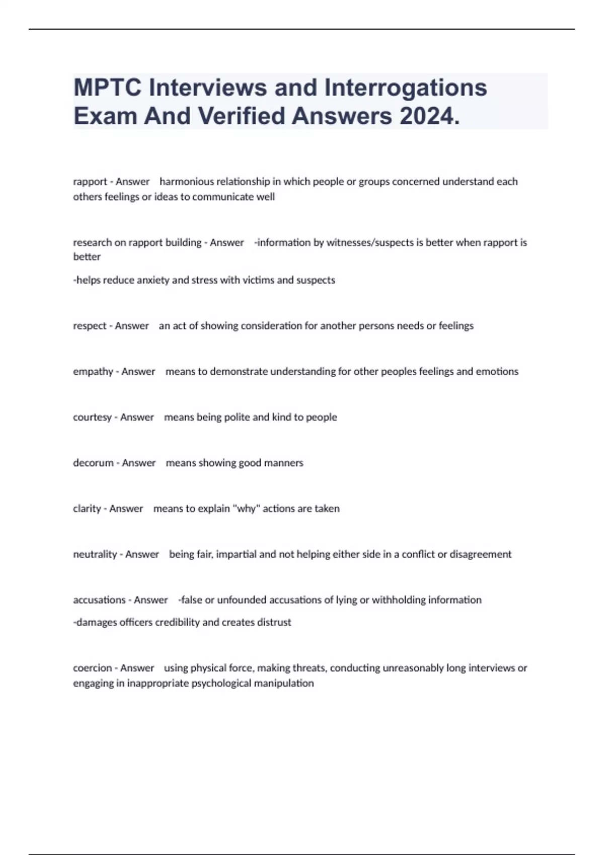 MPTC Interviews and Interrogations Exam And Verified Answers 2024.