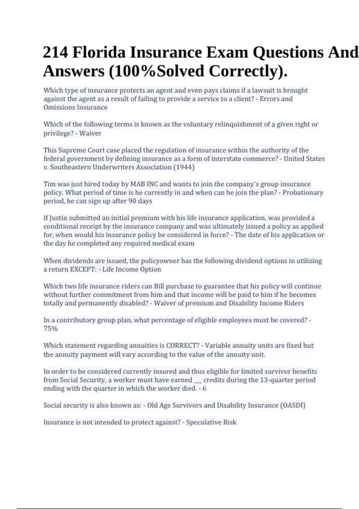 214 Florida Insurance Exam Questions And Answers (100%Solved Correctly). Which type of insurance protects an agent and even pays claims if a lawsuit is brought against the agent as a result of failing to provide a service to a client? - Errors and Omissions Insurance Which of the following terms is known as the voluntary relinquishment of a given right or privilege? - Waiver This Supreme Court case placed the regulation of insurance within the authority of the federal government by defining insurance as a form of interstate commerce? - United States v. Southeastern Underwriters Association (1944) Tim was just hired today by MAB INC and wants to join the company's group insurance policy. What period of time is he currently in and when can he join the plan? - Probationary period, he can sign up after 90 days If Justin submitted an initial premium with his life insurance application, was provided a conditional receipt by the insurance company and was ultimately issued a policy as applied for, when would his insurance policy be considered in force? - The date of his application or the day he completed any required medical exam When dividends are issued, the policyowner has the following dividend options in utilizing a return EXCEPT: - Life Income Option Which two life insurance riders can Bill purchase to guarantee that his policy will continue without further commitment from him and that income will be paid to him if he becomes totally and permanently disabled? - Waiver of premium and Disability Income Riders In a contributory group plan, what percentage of eligible employees must be covered? - 75% Which statement regarding annuities is CORRECT? - Variable annuity units are fixed but the annuity payment will vary according to the value of the annuity unit. In order to be considered currently insured and thus eligible for limited survivor benefits from Social Security, a worker must have earned ___ credits during the 13-quarter period ending with the quarter in which the worker died. - 6 Social security is also known as: - Old Age Survivors and Disability Insurance (OASDI) Insurance is not intended to protect against? - Speculative Risk 214 Florida Insurance Exam Questions And Answers (100%Solved Correctly). Under a family plan life insurance policy, coverage on the breadwinner is often provided by which of the following insurance types? - Whole Life Which of the following statements regarding annuity settlement or payout options is NOT true? - If the annuitant dies before the principal sum is depleted, the Refund Life Annuity Option will pay the entire annuity amount to the beneficiary in a lump sum payment or over scheduled installments.