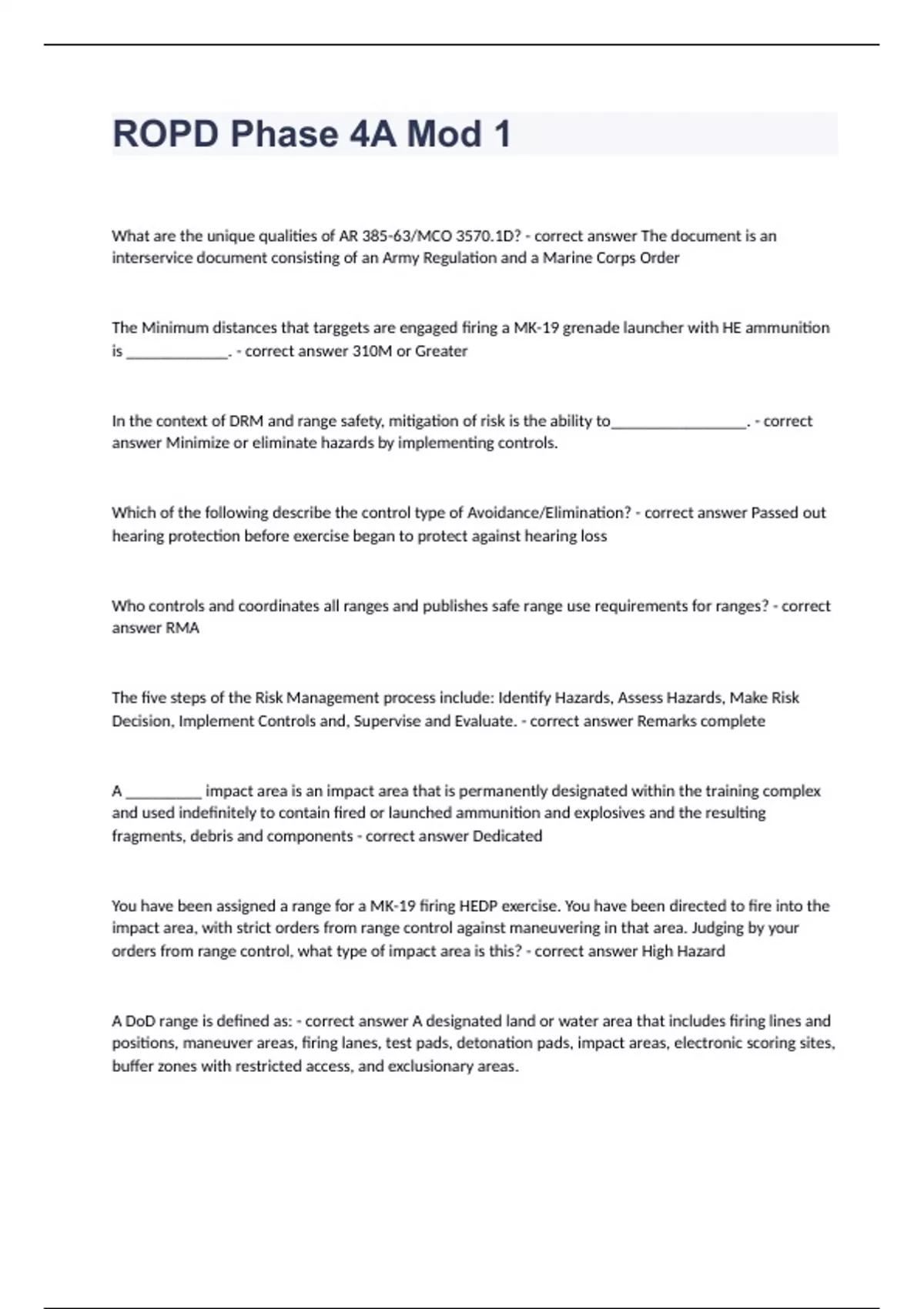 ROPD Phase 4A Mod 1 Question and answers 2023/2024 verified to passWhat are the unique qualities of AR 385-63/MCO 3570.1D? - correct answer The document is an interservice document consisting of an Army Regulation and a Marine Corps Order The Minimum distances that targgets are engaged firing a MK-19 grenade launcher with HE ammunition is ____________. - correct answer 310M or Greater In the context of DRM and range safety, mitigation of risk is the ability to________________. - correct answer Minimize or eliminate hazards by implementing controls. Which of the following describe the control type of Avoidance/Elimination? - correct answer Passed out hearing protection before exercise began to protect against hearing loss