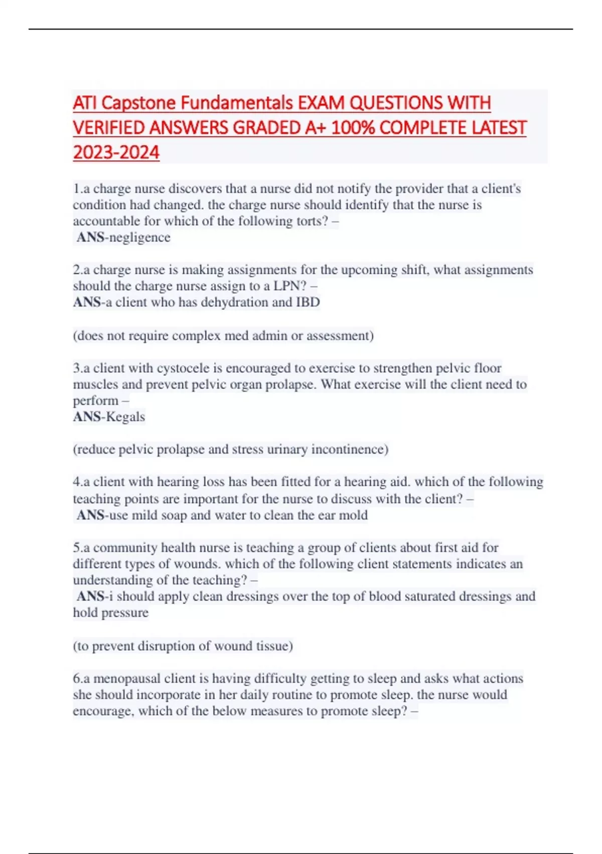 ATI Capstone Fundamentals EXAM QUESTIONS WITH VERIFIED ANSWERS GRADED A+ 100% COMPLETE LATEST 1.a charge nurse discovers that a nurse did not notify the provider that a client's condition had changed. the charge nurse should identify that the nurse is accountable for which of the following torts? – ANS-negligence 2.a charge nurse is making assignments for the upcoming shift, what assignments should the charge nurse assign to a LPN? – ANS-a client who has dehydration and IBD (does not require complex med admin or assessment) 3.a client with cystocele is encouraged to exercise to strengthen pelvic floor muscles and prevent pelvic organ prolapse. What exercise will the client need to perform – ANS-Kegals (reduce pelvic prolapse and stress urinary incontinence) 4.a client with hearing loss has been fitted for a hearing aid. which of the following teaching points are important for the nurse to discuss with the client? – ANS-use mild soap and water to clean the ear mold 5.a community health nurse is teaching a group of clients about first aid for different types of wounds. which of the following client statements indicates an understanding of the teaching? – ANS-i should apply clean dressings over the top of blood saturated dressings and hold pressure (to prevent disruption of wo