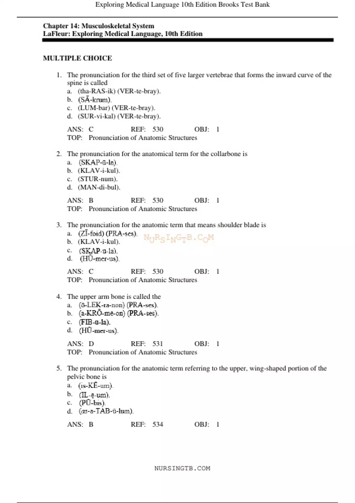 Chapter 14: Musculoskeletal System LaFleur: Exploring Medical Language, 10th Edition MULTIPLE CHOICE 1. The pronunciation for the third set of five larger vertebrae that forms the inward curve of the spine is called a. (tha-RAS-ik) (VER-te-bray). b. c. (LUM-bar) (VER-te-bray). d. (SUR-vi-kal) (VER-te-bray). ANS: C REF: 530 OBJ: 1 TOP: Pronunciation of Anatomic Structures 2. The pronunciation for the anatomical term for the collarbone is a. b. (KLAV-i-kul). c. (STUR-num). d. (MAN-di-bul). ANS: B REF: 530 OBJ: 1 TOP: Pronunciation of Anatomic Structures 3. The pronunciation for the anatomic term that means shoulder blade is a. b. (KLAV-i-kul). c. d. ANS: C REF: 530 OBJ: 1 TOP: Pronunciation of Anatomic Structures 4. The upper arm bone is called the a. b. c. d. ANS: D REF: 531 OBJ: 1 TOP: Pronunciation of Anatomic Structures 5. The pronunciation for the anatomic term referring to the upper, wing-shaped portion of the pelvic bone is a. b. c. d. ANS: B REF: 534 OBJ: 1