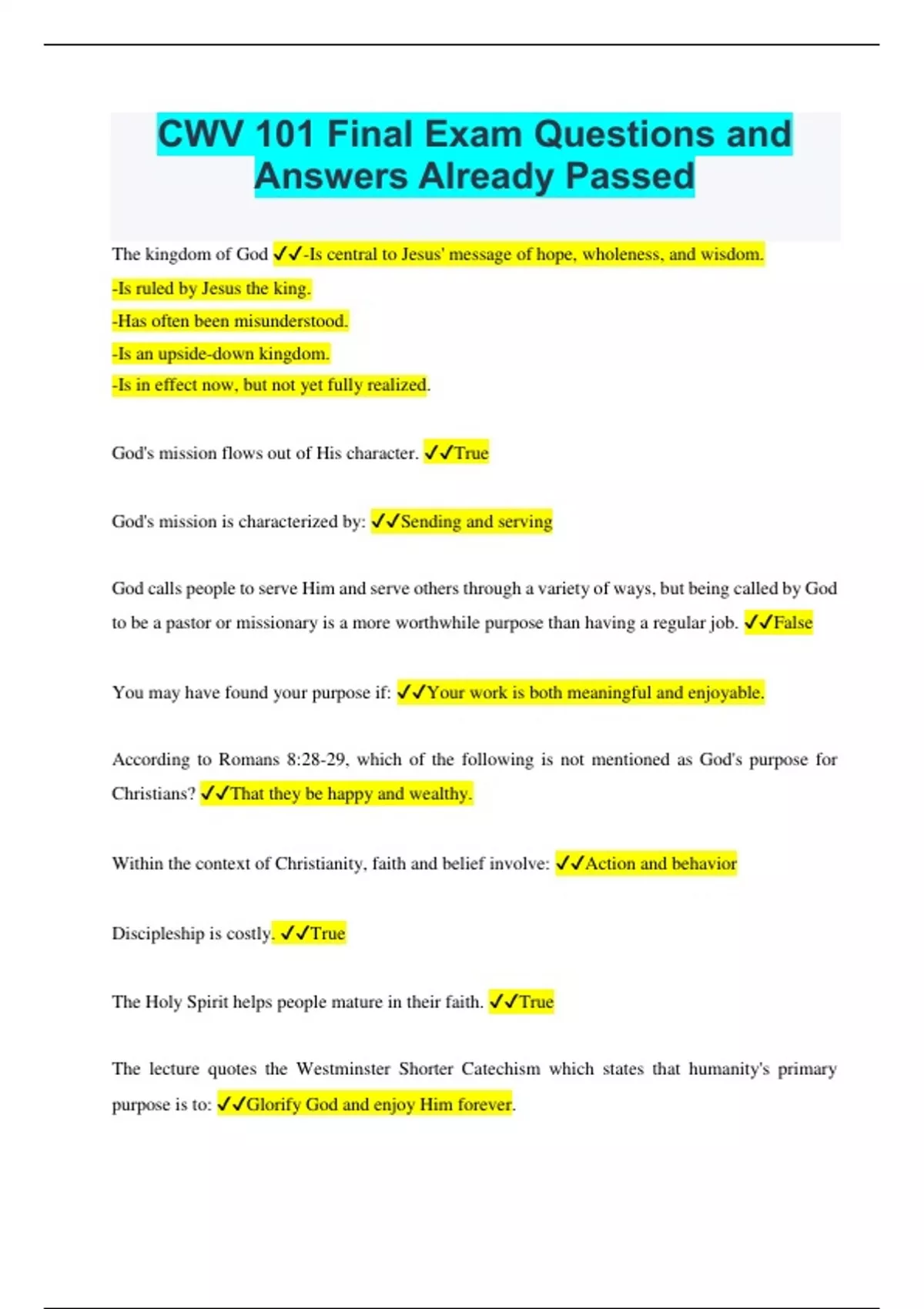 The kingdom of God -Is central to Jesus' message of hope, wholeness, and wisdom. -Is ruled by Jesus the king. -Has often been misunderstood. -Is an upside-down kingdom. -Is in effect now, but not yet fully realized. God's mission flows out of His character. True God's mission is characterized by: Sending and serving God calls people to serve Him and serve others through a variety of ways, but being called by God to be a pastor or missionary is a more worthwhile purpose than having a regular job. False You may have found your purpose if: Your work is both meaningful and enjoyable. According to Romans 8:28-29, which of the following is not mentioned as God's purpose for Christians? That they be happy and wealthy. Within the context of Christianity, faith and belief involve: Action and behavior Discipleship is costly. True