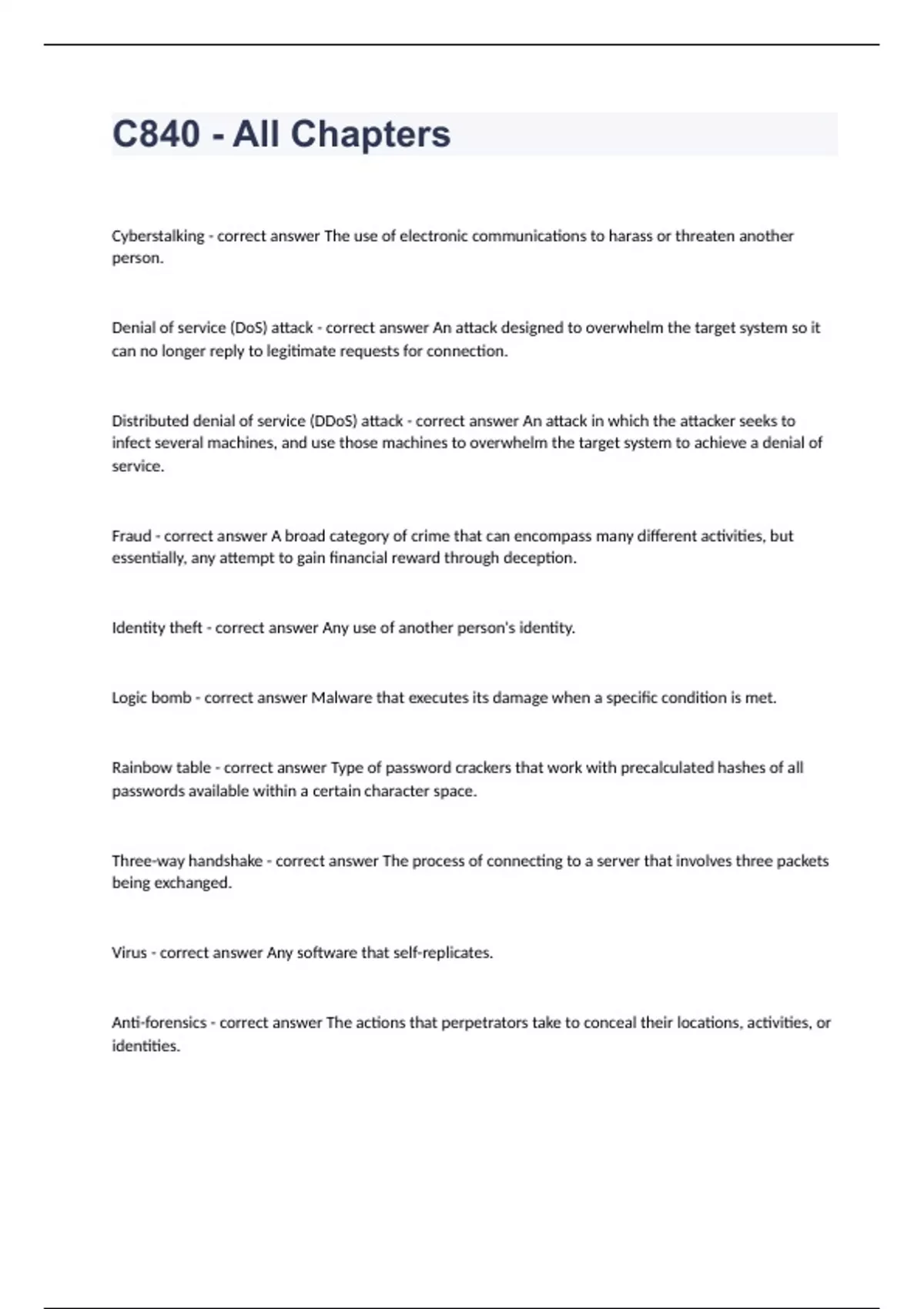 C840 Question and answers 100% correct 2023/2024Cyberstalking - correct answer The use of electronic communications to harass or threaten another person. Denial of service (DoS) attack - correct answer An attack designed to overwhelm the target system so it can no longer reply to legitimate requests for connection. Distributed denial of service (DDoS) attack - correct answer An attack in which the attacker seeks to infect several machines, and use those machines to overwhelm the target system to achieve a denial of service. Fraud - correct answer A broad category of crime that can encompass many different activities, but essentially, any attempt to gain financial reward through deception. Identity theft - correct an