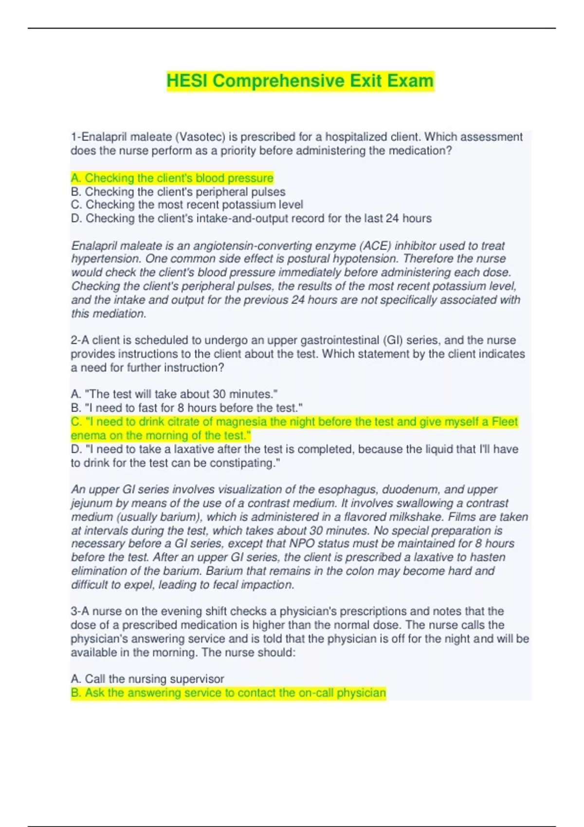 HESI Comprehensive Exit Exam - Questions, Answers and Rationales 1-Enalapril maleate (Vasotec) is prescribed for a hospitalized client. Which assessment does the nurse perform as a priority before administering the medication? A. Checking the client's blood pressure B. Checking the client's peripheral pulses C. Checking the most recent potassium level D. Checking the client's intake-and-output record for the last 24 hours Enalapril maleate is an angiotensin-converting enzyme (ACE) inhibitor used to treat hypertension. One common side effect is postural hypotension. Therefore the nurse would check the client's blood pressure immediately before administering each dose. Checking the client's peripheral pulses, the results of the most recent potassium level, and the intake and output for the previous 24 hours are not specifically associated with this mediation. 2-A client is scheduled to undergo an upper gastrointestinal (GI) series, and the nurse provides instructions to the client about the test. Which statement by the client indicates a need for further instruction? A. "The test will take about 30 minutes." B. "I need to fast for 8 hours before the test." C. "I need to drink citrate of magnesia the night before the test and give myself a Fleet enema on the morning of the test." D. "I need to take a laxative after the test is completed, because the liquid that I'll have to drink for the test can be constipating." An upper GI series involves visualization of the esophagus, duodenum, and upper jejunum by means of the use of a contrast medium. It involves swallowing a contrast medium (usually barium), which is administered in a flavored milkshake. Films are taken at intervals during the test, which takes about 30 minutes. No special preparation is necessary before a GI series, except that NPO status must be maintained for 8 hours before the test. After an upper GI series, the client is prescribed a laxative to hasten elimination of the barium. Barium that remains in the colon may become hard and difficult to expel, leading to fecal impaction. 3-A nurse on the evening shift checks a physician's prescriptions and notes that the dose of a prescribed medication is higher than the normal dose. The nurse calls the physician's answering service and is told that the physician is off for the night and will be available in the morning. The nurse should: A. Call the nursing supervisor B. Ask the answering service to contact the on-call physician C. Withhold the medication until the physician can be reached in the morning D. Administer the medication but consult the physician when he becomes available 4.An emergency department (ED) nurse is monitoring a client with suspected acute myocardial infarction (MI) who is awaiting transfer to the coronary intensive care unit. The nurse notes the sudden onset of premature ventricular contractions (PVCs) on the monitor, checks the client's carotid pulse, and determines that the PVCs are not resulting in perfusion. The appropriate action by the nurse is: A. Documenting the findings B. Asking the ED physician to check the client C. Continuing to monitor the client's cardiac status D. Informing the client that PVCs are expected after an MI 5.NPO status is imposed 8 hours before the procedure on a client scheduled to undergo electroconvulsive therapy (ECT) at 1 p.m. On the morning of the procedure, the nurse checks the client's record and notes that the client routinely takes an oral antihypertensive medication each morning. The nurse should: A. Administer the antihypertensive with a small sip of water B. Withhold the antihypertensive and administer it at bedtime C. Administer the medication by way of the intravenous (IV) route D. Hold the antihypertensive and resume its administration on the day after the ECT 6 A client who recently underwent coronary artery bypass graft surgery comes to the physician's office for a follow-up visit. On assessment, the client tells the nurse that he is feeling depressed. Which response by the nurse is therapeutic? A. "Tell me more about what you're feeling." B. "That's a normal response after this type of surgery." C. "It will take time, but, I promise you, you will get over this depression." D. "Every client who has this surgery feels the same way for about a month." 7 A client in labor experiences spontaneous rupture of the membranes. The nurse immediately counts the fetal heart rate (FHR) for 1 full minute and then checks the amniotic fluid. The nurse notes that the fluid is yellow and has a strong odor. Which of the following actions should be the nurse's priority? A. Contacting the physician B. Documenting the findings C. Checking the fluid for protein D. Continuing to monitor the client and the FHR 8 A nurse has assisted a physician in inserting a central venous access device into a client with a diagnosis of severe malnutrition who will be receiving parenteral nutrition (PN). After insertion of the catheter, the nurse immediately plans to: A. Call the radiography department to obtain a chest x-ray B. Check the client's blood glucose level to serve as a baseline measurement C. Hang the prescribed bag of PN and start the infusion at the prescribed rate D. Infuse normal saline solution through the catheter at a rate of 100 mL/hr to maintain patency 9 A rape victim being treated in the emergency department says to the nurse, "I'm really worried that I've got HIV now." What is the appropriate response by the nurse? A. "HIV is rarely an issue in rape victims." B. "Every rape victim is concerned about HIV." C. "You're more likely to get pregnant than to contract HIV." D. "Let's talk about the information that you need to determine your risk of contracting HIV." 10 A client is taking prescribed ibuprofen (Motrin), 300 mg orally four times daily, to relieve joint pain resulting from rheumatoid arthritis. The client tells the nurse that the medication is causing nausea and indigestion. The nurse should tell the client to: A. Contact the 