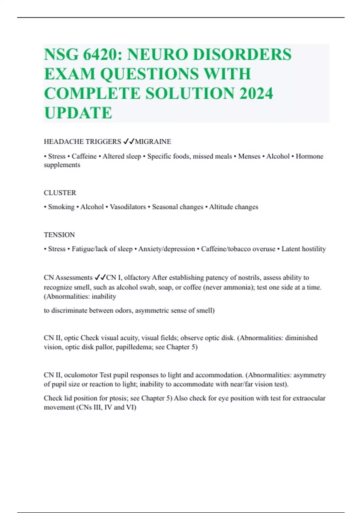 NSG 6420: NEURO DISORDERS EXAM QUESTIONS WITH COMPLETE SOLUTION 2024 UPDATE HEADACHE TRIGGERS MIGRAINE • Stress • Caffeine • Altered sleep • Specific foods, missed meals • Menses • Alcohol • Hormone supplements CLUSTER • Smoking • Alcohol • Vasodilators • Seasonal changes • Altitude changes TENSION • Stress • Fatigue/lack of sleep • Anxiety/depression • Caffeine/tobacco overuse • Latent hostility CN Assessments CN I, olfactory After establishing patency of nostrils, assess ability to recognize smell, such as alcohol swab, soap, or coffee (never ammonia); test one side at a time. (Abnormalities: inability to discriminate between odors, asymmetric sense of smell) CN II, optic Check visual acuity, visual fields; observe optic disk. (Abnormalities: diminished vision, optic disk pallor, papilledema; see Chapter 5) CN II, oculomotor Test pupil responses to light and accommodation. (Abnormalities: asymmetry of pupil size or reaction to light; inability to accommodate with near/far vision test). Check lid position for ptosis; see Chapter 5) Also check for eye position with test for extraocular movement (CNs III, IV and VI) CN III, oculomotor Observe relative position of each eye and eye movements. CN IV, trochlear (Abnormalities: asymmetrical gaze, nystagmus, limited movement of either eye or both eyes) CN VI, abducens