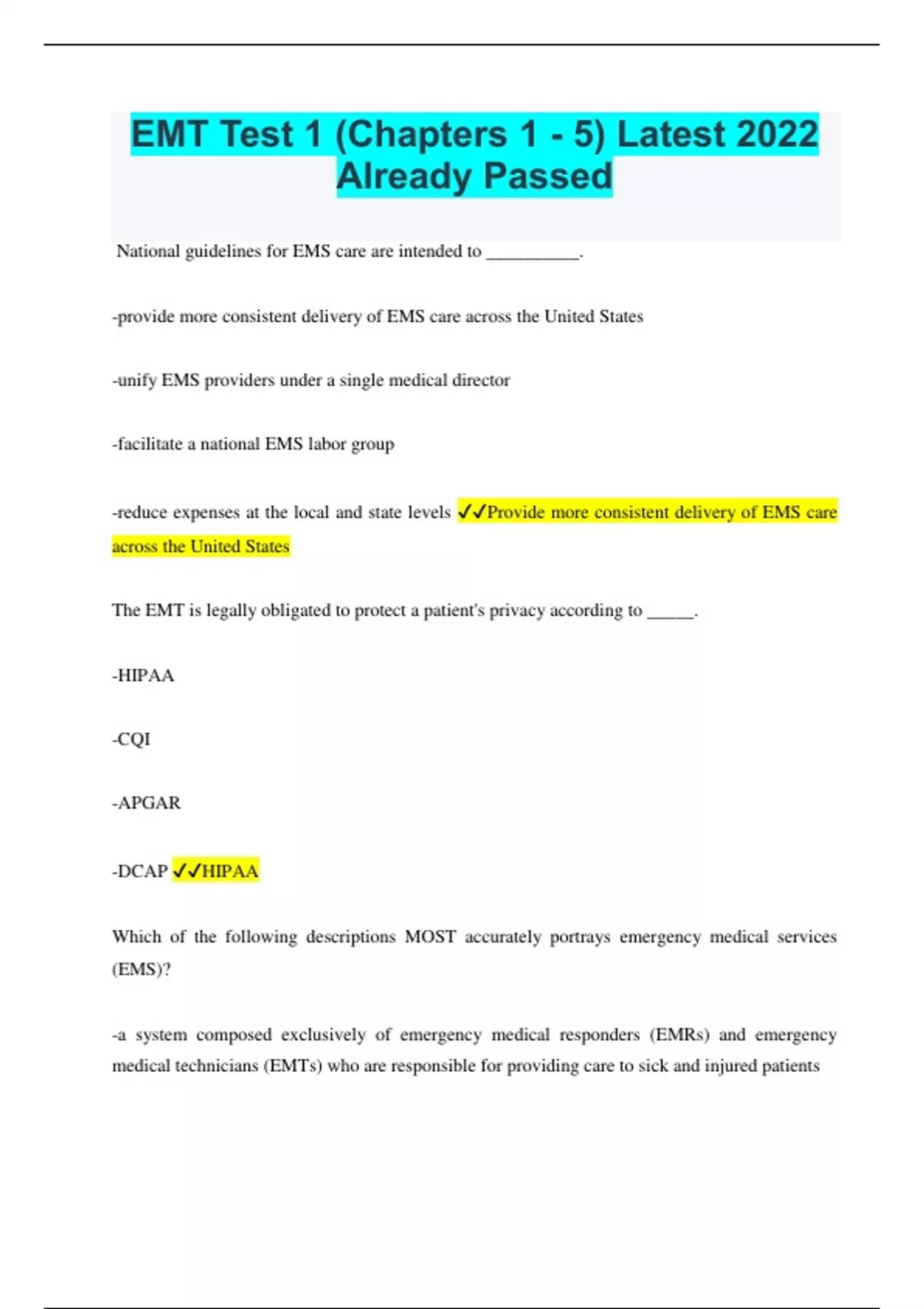EMT Test 1 (Chapters 1 - 5) Latest 2022 Already Passed