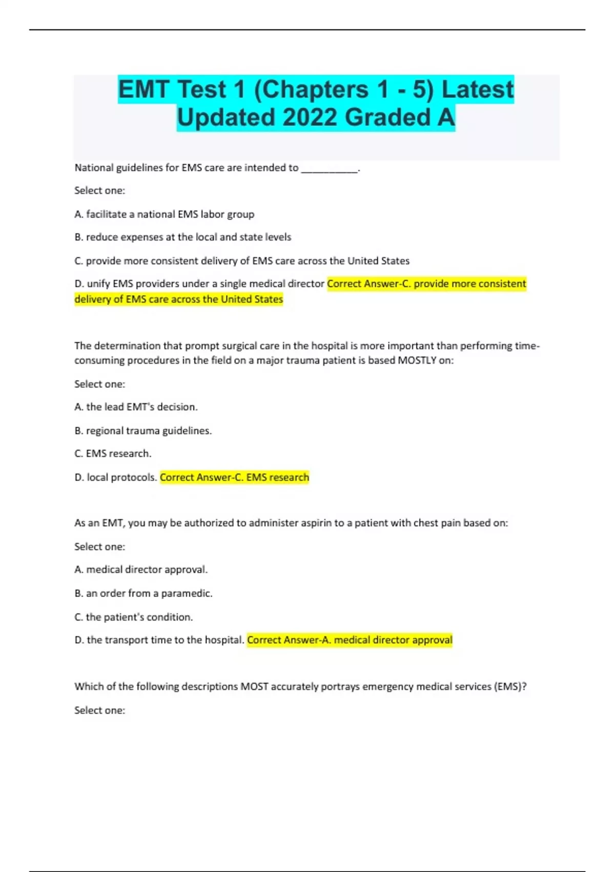 National guidelines for EMS care are intended to __________. Select one: A. facilitate a national EMS labor group B. reduce expenses at the local and state levels C. provide more consistent delivery of EMS care across the United States D. unify EMS providers under a single medical director Correct Answer-C. provide more consistent delivery of EMS care across the United States The determination that prompt surgical care in the hospital is more important than performing time- consuming procedures in the field on a major trauma patient is based MOSTLY on: Select one: A. the lead EMT's decision. B. regional trauma guidelines. C. EMS research. D. local protocols. Correct Answer-C. EMS research As an EMT, you may be authorized to administer aspirin to a patient with chest pain based on: Select one: A. medical director approval. B. an order from a paramedic. C. the patient's condition. D. the transport time to the hospital. Correct Answer-A. medical director approval Which of the following descriptions MOST accurately portrays emergency medical services (EMS)? Select one: