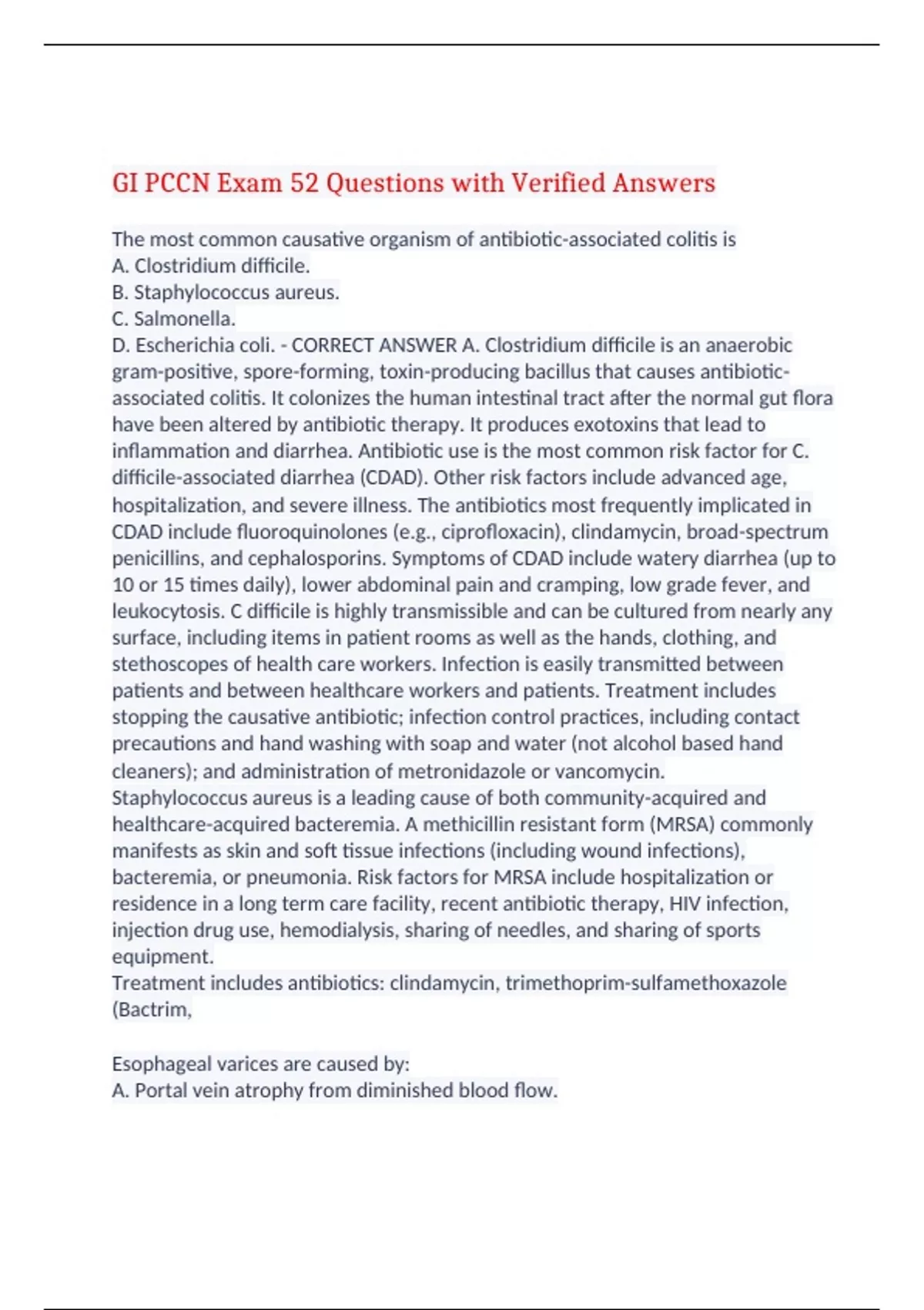 GI PCCN Exam 52 Questions with Verified Answers The most common causative organism of antibiotic-associated colitis is A. Clostridium difficile. B. Staphylococcus aureus. C. Salmonella. D. Escherichia coli. - CORRECT ANSWER A. Clostridium difficile is an anaerobic gram-positive, spore-forming, toxin-producing bacillus that causes antibiotic-associated colitis. It colonizes the human intestinal tract after the normal gut flora have been altered by antibiotic therapy. It produces exotoxins that lead to inflammation and diarrhea. Antibiotic use is the most common risk factor for C. difficile-associated diarrhea (CDAD). Other risk factors include advanced age, hospitalization, and severe illness. The antibiotics most frequently implicated in CDAD include fluoroquinolones (e.g., ciprofloxacin), clindamycin, broad-spectrum penicillins, and cephalosporins. Symptoms of CDAD include watery diarrhea (up to 10 or 15 times daily), lower abdominal pain and cramping, low grade fever, and leukocytosis. C difficile is highly transmissible and can be cultured from nearly any surface, including items in patient rooms as well as the hands, clothing, and stethoscopes of health care workers. Infection is easily transmitted between patients and between healthcare workers and patients. Treatment includes stopping the causative antibiotic; infection control practices, including contact precautions and hand washing with soap and water (not alcohol based hand cleaners); and administration of metronidazole or vancomycin. Staphylococcus aureus is a leading cause of both community-acquired and healthcare-acquired bacteremia. A methicillin resistant form (MRSA) commonly manifests as skin and soft tissue infections (including wound infections), bacteremia, or pneumonia. Risk factors for MRSA include hospitalization or residence in a long term care facility, recent antibiotic therapy, HIV infection, injection drug use, hemodialysis, sharing of needles, and sharing of sports equipment. Treatment includes antibiotics: clindamycin, trimethoprim-sulfamethoxazole (Bactrim, Esophageal varices are caused by: A. Portal vein atrophy from diminished blood flow. B. Congenital esophageal aneurysms. C. A high level of alcohol content in the esophagus. D. Obstruction of and hypertension within the portal vein with resultant shunting of blood to the esophageal veins. - CORRECT ANSWER D. Although esophageal varices can be seen as a complication of alcoholism, they are not related to any alcohol in the esophagus. Esophageal varices are caused by liver disease (often the result of chronic alcoholism). Liver disease increases pressure within the portal vein that is transmitted back into the veins that drain from the gastrointestinal tract including those from the esophagus. The increased backward pressure from the portal vein causes the esophageal veins to dilate. A patient with hepatic failure demonstrates deterioration in handwriting and when asked on exam to hold his arm and hand out like a stop sign, involuntary flapping of the hand (asterixis) is observed. These symptoms are most likely due to: A. Intracranial hemorrhage. B. Sub clinical seizure. C. Alcohol withdrawal. D. Encephalopathy. - CORRECT ANSWER D. Encephalopathy is an anticipated complication of hepatic failure and is caused by high ammonia levels, which cause neurotoxicity. In failure, the liver loses its ability to normally metabolize and detoxify substances. Ammonia is produced by bacteria in the bowel and is a byproduct of protein metabolism. Normally, the liver metabolizes ammonia into urea for excretion. In liver failure, ammonia levels rise. When assessing the abdomen of a patient, the correct order of assessment techniques is: A. Palpation, percussion, auscultation, inspection. B. Inspection, palpation, percussion, auscultation. C. Inspection, auscultation, percussion, palpation. D. Percussion, palpation, auscultation, inspection. - CORRECT ANSWER C. When assessing the abdomen it is important to auscultate before performing percussion or palpation. The performance of palpation or percussion if done first can interfere with the auscultatory assessment. Stress ulceration in the stomach is common in critically ill patients. Stress ulcer prophylaxis is indicated in which of the following patients at highest risk for GI bleeding: Choose one A. Mechanical ventilation for more than 48 hours. B. History of GI ulceration or bleeding in the past year. C. ICU stay longer than 1 week. D. Coagulopathy. E. All of the above. - CORRECT ANSWER E. Two major risk factors for clinically important GI bleeding are mechanical ventilation for more than 48 hours and coagulopathy (defined as a platelet count <50,000, INR >1.5, or aPTT >2 times the control value). In addition, guidelines recommend stress ulcer prophylaxis in patients with a history of GI ulceration or bleeding within the past year, and two or more of the following risk factors: sepsis, ICU admission lasting >1 week, occult GI bleeding lasting ≥6 days, and glucocorticoid therapy. Drugs used to prevent GI bleeding in critically ill patients include which of the following: A. Beta blockers and calcium channel blockers. B. Aldosterone blockers and beta blockers. C. Proton pump inhibitors (PPI) and histamine-2 receptor blockers (H2 blockers). D. ACE inhibitors and angiotensin receptor blockers (ARBs). - CORRECT ANSWER C. H2 blockers and PPI reduce gastric acid secretion. Examples of H2 blockers include cimetidine (Tagamet), ranitidine (Zantac), famotidine (Pepsid), and nizatidine (Axid). Examples of PPI include omeprazole (Prilosec), esomeprazole (Nexium), lansoprazole (Prevacid), and pantoprazole (Protonix). Other drugs that can be used include sucralfate (Carafate) which coats and protects the gastric mucosa without altering gastric acid secretion, and antacids which neutralize gastric acid to protect the gastric mucosa. ACE inhibitors prevent conversion of angiotensin I to angiotensin II and ARBs block angiotensin II at its 