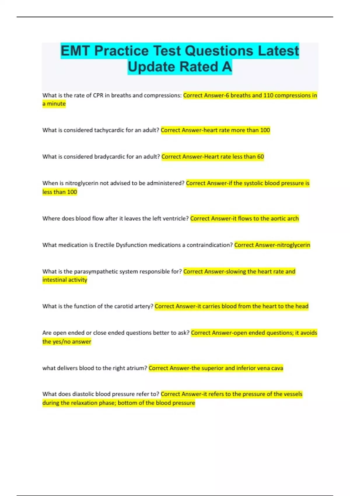 What is the rate of CPR in breaths and compressions: Correct Answer-6 breaths and 110 compressions in a minute What is considered tachycardic for an adult? Correct Answer-heart rate more than 100 What is considered bradycardic for an adult? Correct Answer-Heart rate less than 60 When is nitroglycerin not advised to be administered? Correct Answer-if the systolic blood pressure is less than 100 Where does blood flow after it leaves the left ventricle? Correct Answer-it flows to the aortic arch What medication is Erectile Dysfunction medications a contraindication? Correct Answer-nitroglycerin What is the parasympathetic system responsible for? Correct Answer-slowing the heart rate and intestinal activity What is the function of the carotid artery? Correct Answer-it carries blood from the heart to the head Are open ended or close ended questions better to ask? Correct Answer-open ended questions; it avoids the yes/no answer what delivers blood to the right atrium? Correct Answer-the superior and inferior vena cava What does diastolic blood pressure refer to? Correct Answer-it refers to the pressure of the vessels during the relaxation phase; bottom of the blood pressure