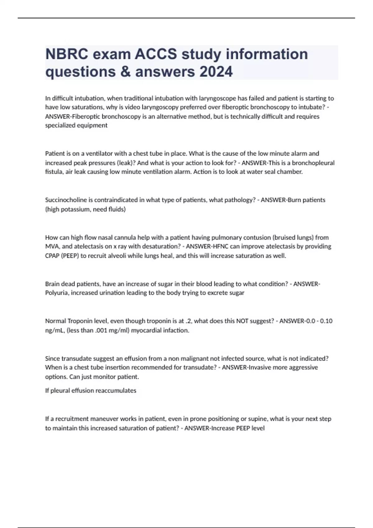 NBRC exam ACCS study information questions & answers 2024 In difficult intubation, when traditional intubation with laryngoscope has failed and patient is starting to have low saturations, why is video laryngoscopy preferred over fiberoptic bronchoscopy to intubate? - ANSWER-Fiberoptic bronchoscopy is an alternative method, but is technically difficult and requires specialized equipment Patient is on a ventilator with a chest tube in place. What is the cause of the low minute alarm and increased peak pressures (leak)? And what is your action to look for? - ANSWER-This is a bronchopleural fistula, air leak causing low minute ventilation alarm. Action is to look at water seal chamber. Succinocholine is contraindicated in what type of patients, what pathology? - ANSWER-Burn patients (high potassium, need fluids) How can high flow nasal cannula help with a patient having pulmonary contusion (bruised lungs) from MVA, and atelectasis on x ray with desaturation? - ANSWER-HFNC can improve atelectasis by providing CPAP (PEEP) to recruit alveoli while lungs heal, and this will increase saturation as well. Brain dead patients, have an increase of sugar in their blood leading to what condition? - ANSWER-Polyuria, increased urination leading to the body trying to excrete sugar Normal Troponin level, even though troponin is at .2, what does this NOT suggest? - ANSWER-0.0 - 0.10 ng/mL, (less than .001 mg/ml) myocardial infaction. Since transudate suggest an effusion from a non malignant not infected source, what is not indicated? When is a chest tube insertion recommended for transudate? - ANSWER-Invasive more aggressive options. Can just monitor patient. If pleural effusion reaccumulates If a recruitment maneuver works in patient, even in prone positioning or supine, what is your next step to maintain this increased saturation of patient? - ANSWER-Increase PEEP level