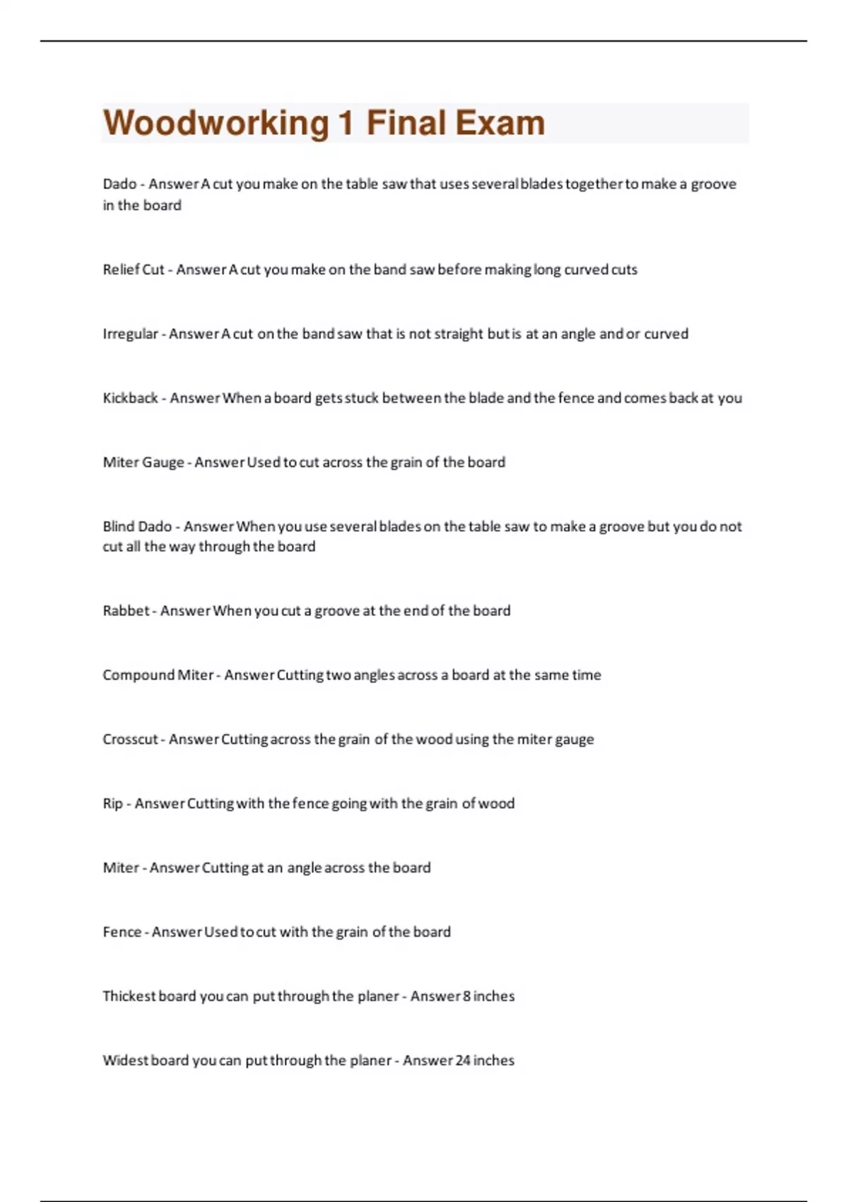 Dado - Answer A cut you make on the table saw that uses several blades together to make a groove in the board Relief Cut - Answer A cut you make on the band saw before making long curved cuts Irregular - Answer A cut on the band saw that is not straight but is at an angle and or curved Kickback - Answer When a board gets stuck between the blade and the fence and comes back at you Miter Gauge - Answer Used to cut across the grain of the board Blind Dado - Answer When you use several blades on the table saw to make a groove but you do not cut all the way through the board Rabbet - Answer When you cut a groove at the end of the board Compound Miter - Answer Cutting two angles across a board at the same time Crosscut - Answer Cutting across the grain of the wood using the miter gauge Rip - Answer Cutting with the fence going with the grain of wood Miter - Answer Cutting at an angle across the board Fence - Answer Used to cut with the grain of the board Thickest board you can put through the planer - Answer 8 inches Widest board you can put through the planer - Answer 24 inchesWhere should you not stand when operating the planer - Answer Behind the board Planer: What makes the infeed rollers differemt from the outfeed rollers - Answer Indeed have grooves Maximum depth of cut for jointing an edge - Answer 1/8 of an inch Maximum depth of cut for jointing a surface - Answer 1/16 of an inch Shortest board you can put through the jointer - Answer 10 inches