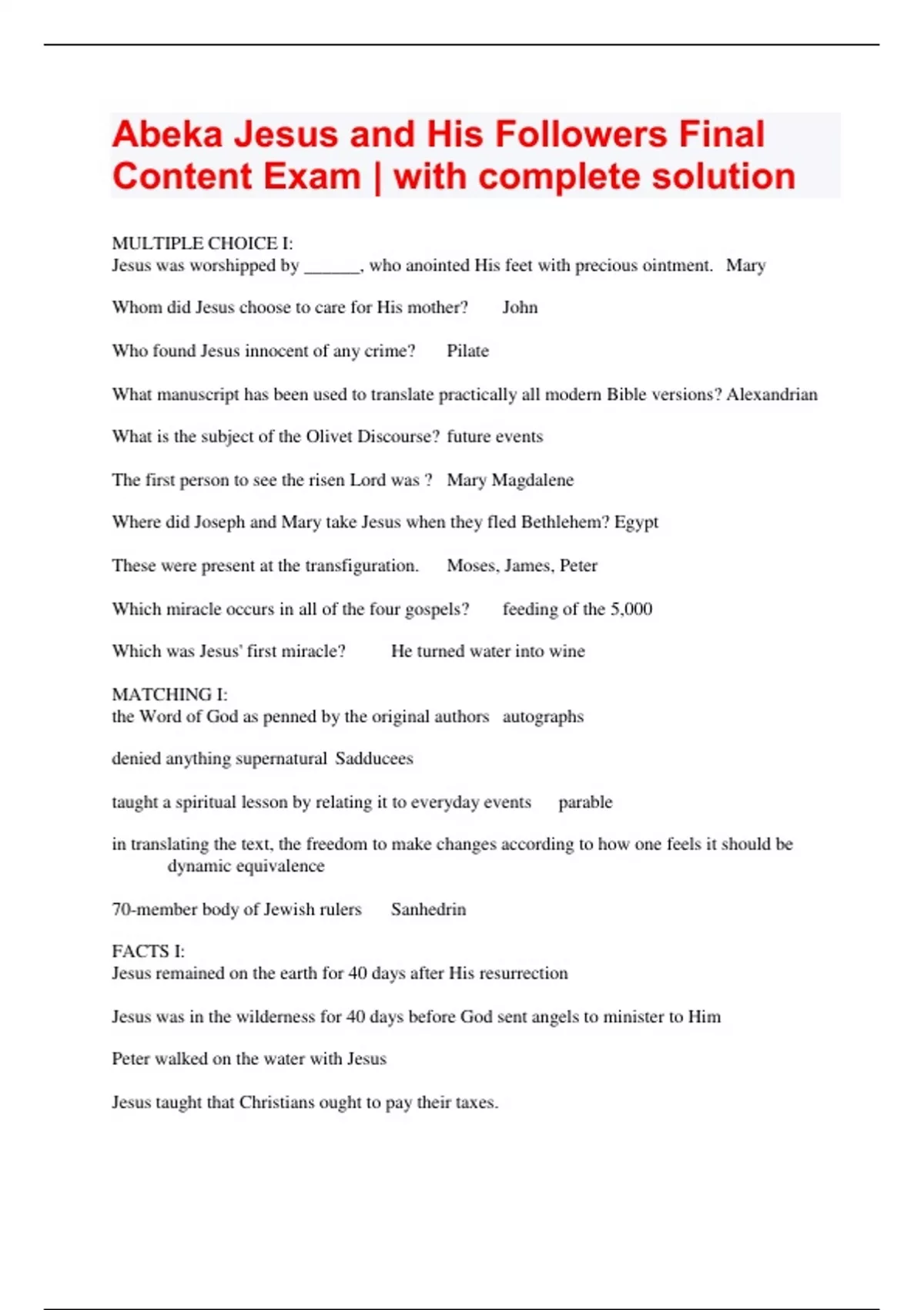 Abeka Jesus and His Followers Final Content Exam | with complete solution