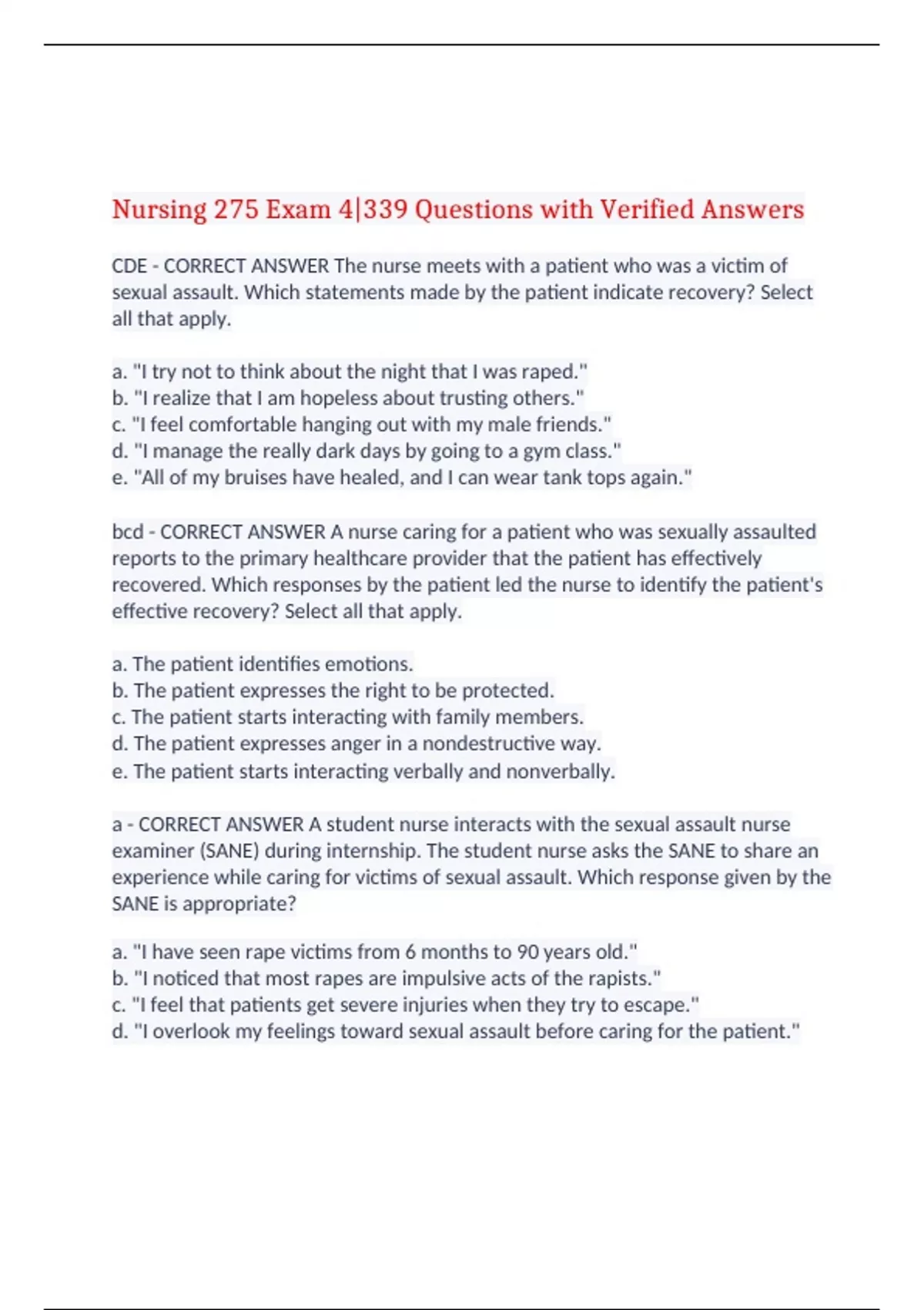 Nursing 275 Exam 4|339 Questions with Verified Answers CDE - CORRECT ANSWER The nurse meets with a patient who was a victim of sexual assault. Which statements made by the patient indicate recovery? Select all that apply. a. "I try not to think about the night that I was raped." b. "I realize that I am hopeless about trusting others." c. "I feel comfortable hanging out with my male friends." d. "I manage the really dark days by going to a gym class." e. "All of my bruises have healed, and I can wear tank tops again." bcd - CORRECT ANSWER A nurse caring for a patient who was sexually assaulted reports to the primary healthcare provider that the patient has effectively recovered. Which responses by the patient led the nurse to identify the patient's effective recovery? Select all that apply. a. The patient identifies emotions. b. The patient expresses the right to be protected. c. The patient starts interacting with family members. d. The patient expresses anger in a nondestructive way. e. The patient starts interacting verbally and nonverbally. a - CORRECT ANSWER A student nurse interacts with the sexual assault nurse examiner (SANE) during internship. The student nurse asks the SANE to share an experience while caring for victims of sexual assault. Which response given by the SANE is appropriate? a. "I have seen rape victims from 6 months to 90 years old." b. "I noticed that most rapes are impulsive acts of the rapists." c. "I feel that patients get severe injuries when they try to escape." d. "I overlook my feelings toward sexual assault before caring for the patient." b - CORRECT ANSWER Which nursing action has priority for a patient immediately following a reported rape? a. Provide written follow-up instructions. b. Document the debris and dirt on the patient's clothing. c. Give the patient alone time to recover after the incident. d. Give the patient prophylactic analgesics after the incident. abcde - CORRECT ANSWER Arrange the steps of the medical exam of a rape victim based on best practice guidelines. a. Head-to-toe physical assessment b. Genital examination c. Collection of evidence d. Documentation of biological and physical findings e. Treatment, discharge planning, and follow-up care a - CORRECT ANSWER When the nurse finishes addressing a group of college women about rape, the following comments are heard during the discussion period. Which comment calls for additional teaching by the nurse? a. "So if you dress conservatively, your risk of being raped is small." b. "Who would have guessed that most rape victims know the rapist?" c. "It makes sense that rape is a crime of violence, not a crime of sex." d. "I always thought rapes happened at night, but now I know that isn't true." b - CORRECT ANSWER The nurse is providing discharge teaching to a patient who was recently raped. What should the nurse say regarding the psychological effects of the assault? a. "You may feel hyperactive and notice an increased surge of energy." b. "It is normal to experience depression after being sexually assaulted." c. "People often report the need to be social after a sexual assault incident." d. "Let the healthcare provider know immediately if you feel scared or worried." ade - CORRECT ANSWER Which statement is true regarding the nursing care of a forensic patient? Select all that apply. a. A victim of a sexual assault meets the criteria of a forensic patient. b. Nurses should pose questions asking "why" certain events occurred. c. All sexual assault victims require a complete suicide assessment interview initially. d. Asking about possible suicidal ideations may be an appropriate interview question. e. Sexual assault nurse examiners (SANE) are trained especially to meet the needs of a sexual assault victim. revictimization - CORRECT ANSWER The nurse is explaining the forensic exam to a patient who was just sexually assaulted. The patient does not want to be examined and says, "I feel like my body just keeps getting violated more and more." Which is the best term used to describe this feeling? d - CORRECT ANSWER The nurse at a university health center leads a dialogue with female freshmen about rape and sexual assault. One student says, "If I avoid strangers or situations where I am alone outside at night, I'll be safe from sexual attacks." Choose the nurse's best response. a. "Your plan is not adequate. You could still be raped or sexually assaulted." b. "I am glad you have this excellent safety plan. Would others like to comment?" c. "It's better to walk with someone or call security when you enter or leave a building." d. "Sexual assaults are more often perpetrated by acquaintances. Let's discuss ways to prevent that." d - CORRECT ANSWER A woman was found confused and disoriented after being abducted and raped at gunpoint by an unknown assailant. The emergency department nurse makes these observations about the woman: talking rapidly in disjointed phrases, unable to concentrate, indecisive when asked to make simple decisions. What is the woman's level of anxiety? a. Weak b. Mild c. Moderate d. Severe b - CORRECT ANSWER After an abduction and rape at gunpoint by an unknown assailant, which assessment finding best indicates that a patient is in the acute phase of the rape-trauma syndrome? a. Decreased motor activity b. Confusion and disbelief c. Flashbacks and dreams d. Fears and phobias b - CORRECT ANSWER A nurse interviews a patient abducted and raped at gunpoint by an unknown assailant. The patient says, "I shouldn't have been there alone. I knew it was a dangerous area." What is the patient's present coping strategy? a. Projection b. Self-blame c. Suppression d. Rationalization b - CORRECT ANSWER An emergency department nurse prepares to assist with evidence collection for a sexual assault victim. Prior to photographs and pelvic examination, what documentation is important? a. The patient's vital signs b. Consent signed by the patient c. Supervision and credentials of the examiner d. Storage