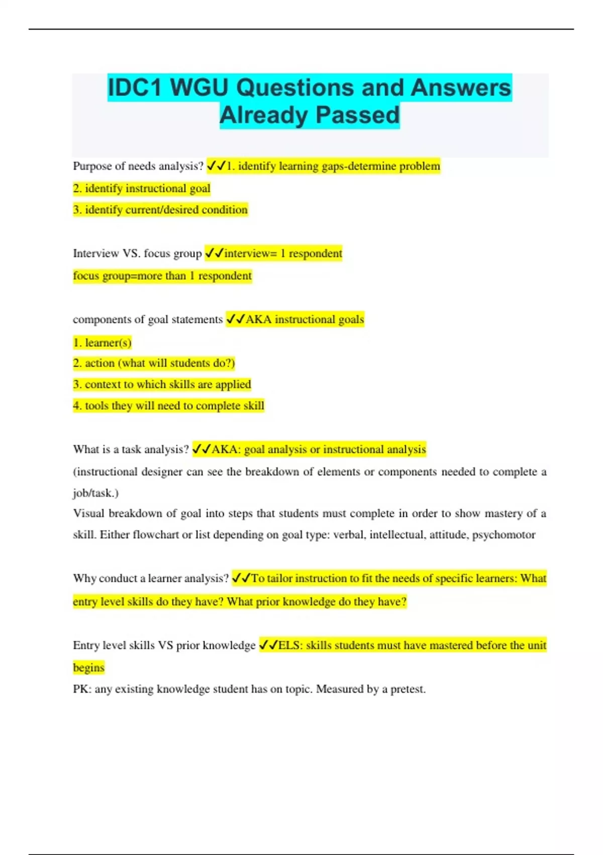 Purpose of needs analysis? 1. identify learning gaps-determine problem 2. identify instructional goal 3. identify current/desired condition Interview VS. focus group interview= 1 respondent focus group=more than 1 respondent components of goal statements AKA instructional goals 1. learner(s) 2. action (what will students do?) 3. context to which skills are applied 4. tools they will need to complete skill What is a task analysis? AKA: goal analysis or instructional analysis (instructional designer can see the breakdown of elements or components needed to complete a job/task.) Visual breakdown of goal into steps that students must complete in order to show mastery of a skill. Either flowchart or list depending on goal type: verbal, intellectual, attitude, psychomotor Why conduct a learner analysis? To tailor instruction to fit the needs of specific learners: What entry level skills do they have? What prior knowledge do they have? Entry level skills VS prior knowledge ELS: skills students must have mastered before the unit begins PK: any existing knowledge student has on topic. Measured by a pretest.