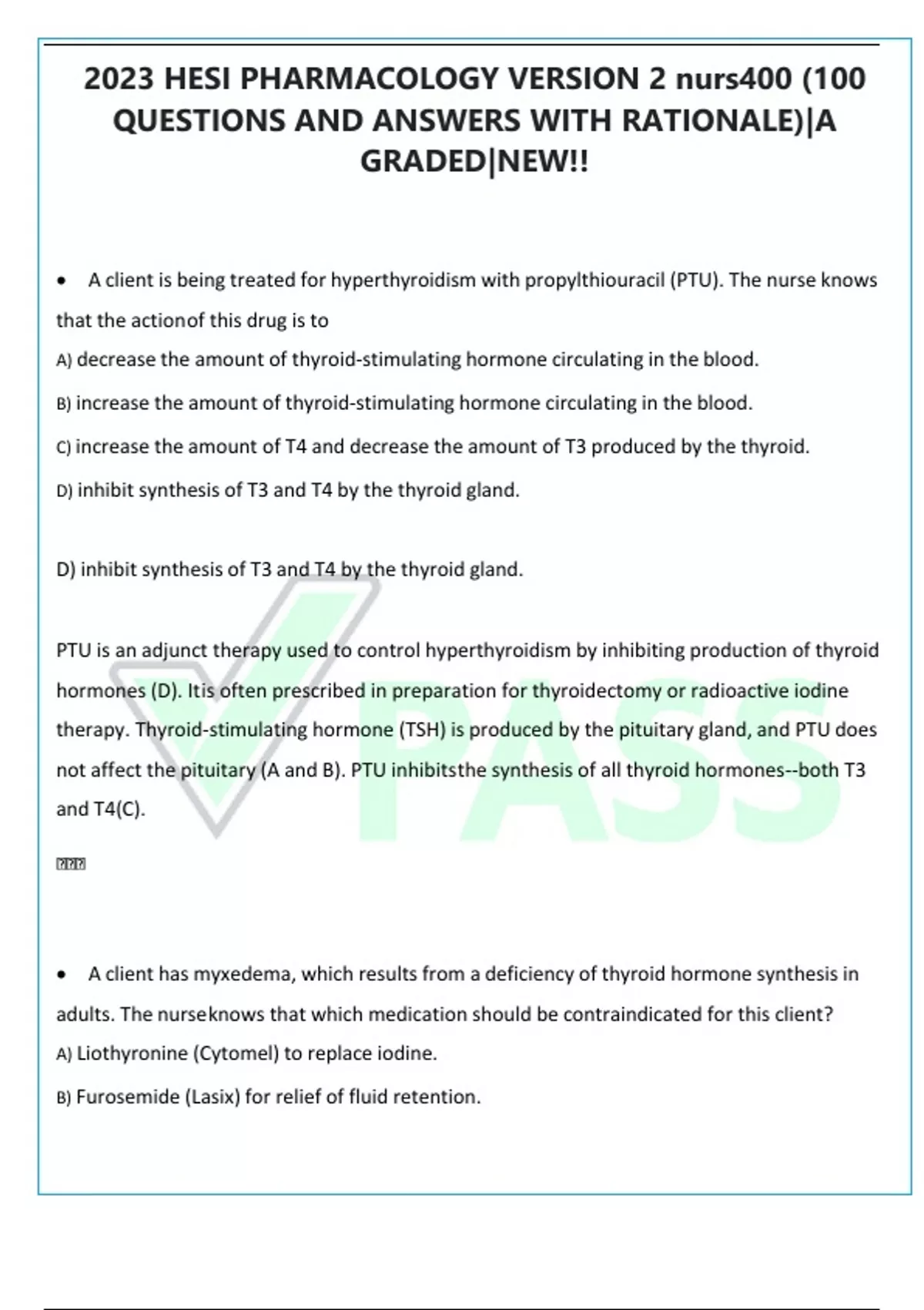 2023 HESI PHARMACOLOGY VERSION 2 nurs400 (100 QUESTIONS AND ANSWERS WITH RATIONALE)|A GRADED|NEW!! A client is being treated for hyperthyroidism with propylthiouracil (PTU). The nurse knows that the actionof this drug is to A) decrease the amount of thyroid-stimulating hormone circulating in the blood. B) increase the amount of thyroid-stimulating hormone circulating in the blood. C) increase the amount of T4 and decrease the amount of T3 produced by the thyroid. D) inhibit synthesis of T3 and T4 by the thyroid gland. D) inhibit synthesis of T3 and T4 by the thyroid gland. PTU is an adjunct therapy used to control hyperthyroidism by inhibiting production of thyroid hormones (D). Itis often prescribed in preparation for thyroidectomy or radioactive iodine therapy. Thyroid-stimulating hormone (TSH) is produced by the pituitary gland, and PTU does not affect the pituitary (A and B). PTU inhibitsthe synthesis of all thyroid hormones--both T3 and T4(C). A client has myxedema, which results from a deficiency of thyroid hormone synthesis in adults. The nurseknows that which medication should be contraindicated for this client? A) Liothyronine (Cytomel) to replace iodine. B) Furosemide (Lasix) for relief of fluid retention. 2023 HESI PHARMACOLOGY VERSION 2 nurs400 (100 QUESTIONS AND ANSWERS WITH RATIONALE)|A GRADED|NEW!! C) Pentobarbital sodium (Nembutal Sodium) for sleep. D) Nitroglycerin (Nitrostat) for angina pain. C) Pentobarbital sodium (Nembutal Sodium) for sleep. Persons with myxedema are dangerously hypersensitive to narcotics, barbiturates (C), and anesthetics. Theydo tolerate liothyronine (Cytomel) (A) and usually receive iodine replacement therapy. These clients are alsosusceptible to heart problems such as angina for which nitroglycerin (Nitrostat) (D) would be indicated, and congestive heart failure for which furosemide (Lasix) (B) would be indicated. Which change in data indicates to the nurse that the desired effect of the angiotensin II receptorantagonist valsartan (Diovan) has been achieved? A) Dependent edema reduced from +3 to +1. B) Serum HDL increased from 35 to 55 mg/dl. C) Pulse rate reduced from 150 to 90 beats/minute. D) Blood pressure reduced from 160/90 to 130/80. D) Blood pressure reduced from 160/90 to 130/80. 2023 HESI PHARMACOLOGY VERSION 2 nurs400 (100 QUESTIONS AND ANSWERS WITH RATIONALE)|A GRADED|NEW!! Diovan is an angiotensin receptor blocker, prescribed for the treatment of hypertension. The desired effect isa decrease in blood pressure (D). (A, B, and C) do not describe effects of Diovan. A client is receiving digoxin for the onset of supraventricular tachycardia (SVT). Which laboratory findingsshould the nurse identify that places this client at risk? A) Hypokalemia. B) Hyponatremia. C) Hypercalcemia. D) Low uric acid levels. A) Hypokalemia. Hypokalemia affects myocardial contractility, so (A) places this client at greatest risk for dysrhythmias thatmay be unresponsive to drug therapy. Although an imbalance of serum electrolytes, (B and C), can effect cardiac rhythm, the greatest risk for the client receiving digoxin is (A). (D) does not cause any interactions related to digoxin therapy for supraventricular tachycardia (SVT). 2023 HESI