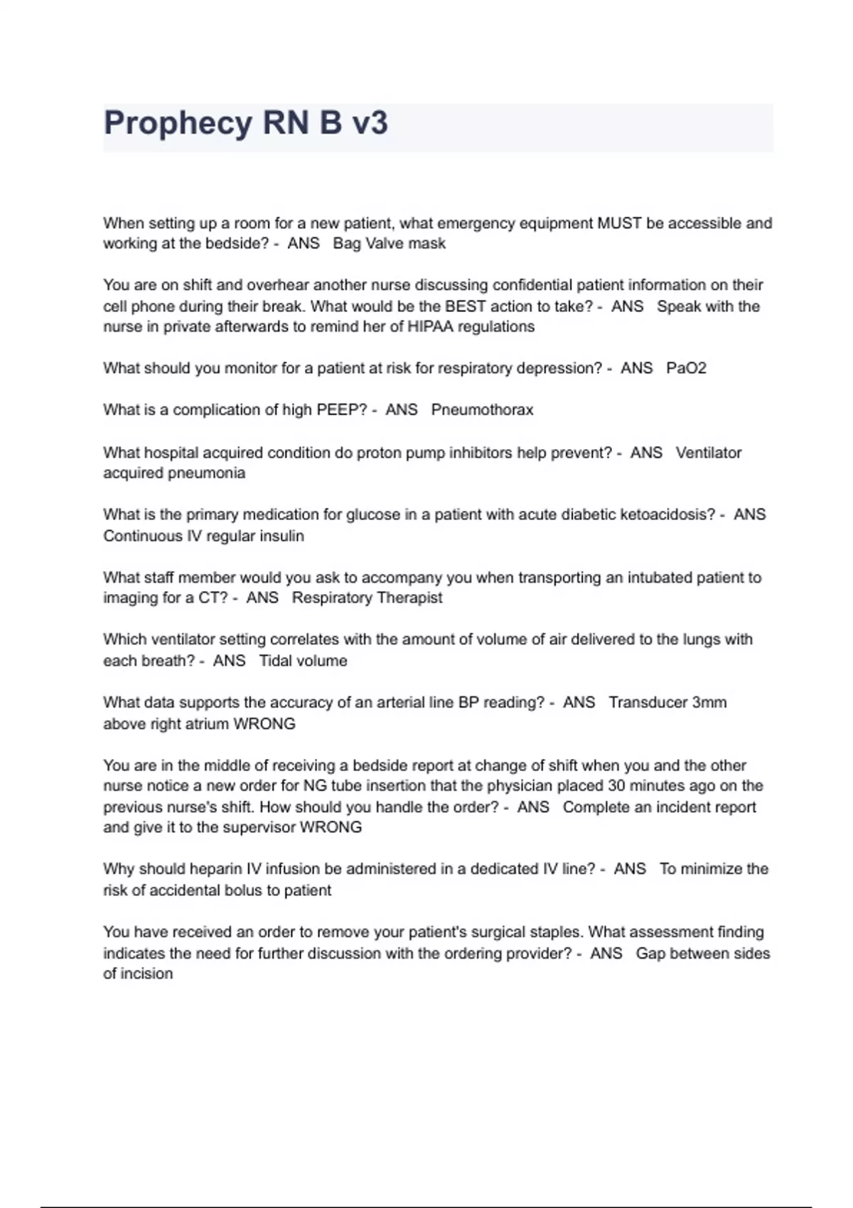 Prophecy RN B v3 Exam Questions And Answers When setting up a room for a new patient, what emergency equipment MUST be accessible and working at the bedside? - ANS Bag Valve mask You are on shift and overhear another nurse discussing confidential patient information on their cell phone during their break. What would be the BEST action to take? - ANS Speak with the nurse in private afterwards to remind her of HIPAA regulations What should you monitor for a patient at risk for respiratory depression? - ANS PaO2 What is a complication of high PEEP? - ANS Pneumothorax What hospital acquired condition do proton pump inhibitors help prevent? - ANS Ventilator acquired pneumonia What is the primary medication for glucose in a patient with acute diabetic ketoacidosis? - ANS Continuous IV regular insulin What staff member would you ask to accompany you when transporting an intubated patient to imaging for a CT? - ANS Respiratory Therapist Which ventilator setting correlates with the amount of volume of air delivered to the lungs with each breath? - ANS Tidal volume What data supports the accuracy of an arterial line BP reading? - ANS Transducer 3mm above right atrium WRONG You are in the middle of receiving a bedside report at change of shift when you and the other nurse notice a new order for NG tube insertion that the physician placed 30 minutes ago on the previous nurse's shift. How should you handle the order? - ANS Complete an incident report and give it to the supervisor WRONG Why should heparin IV infusion be administered in a dedicated IV line? - ANS To minimize the risk of accidental bolus to patient You have received an order to remove your patient's surgical staples. What assessment finding indicates the need for further discussion with the ordering provider? - ANS Gap between sides of incision A new nurse asks you if a patient who is intubated and receiving an IV paralytic can sense what is going on around them. Which of the following is the BEST response? - ANS "The paralytic decreases the patient's awareness of their surroundings." Your patient's with a wound vac keeps alarming with an air leak and the wound care nurse cannot see the patient until tomorrow. What steps can you take to troubleshoot the alarm? - ANS Gently pat around the edge of the transparent dressing What is a frequent complication of pancreatoduodectomy, also known as Whipple surgery? - ANS Delayed gastric empytying You are helping admit a new patient who is unconscious and does not have family at the bedside. While inspecting their belongings you find many $100 bills in their wallet. What should you do NEXT? - ANS Document in the patient's medical record WRONG Which of the following helps prevent errors when programming a smart IV pump to administer a medication infusion? - ANS Utilize the preset concentration whenever possible