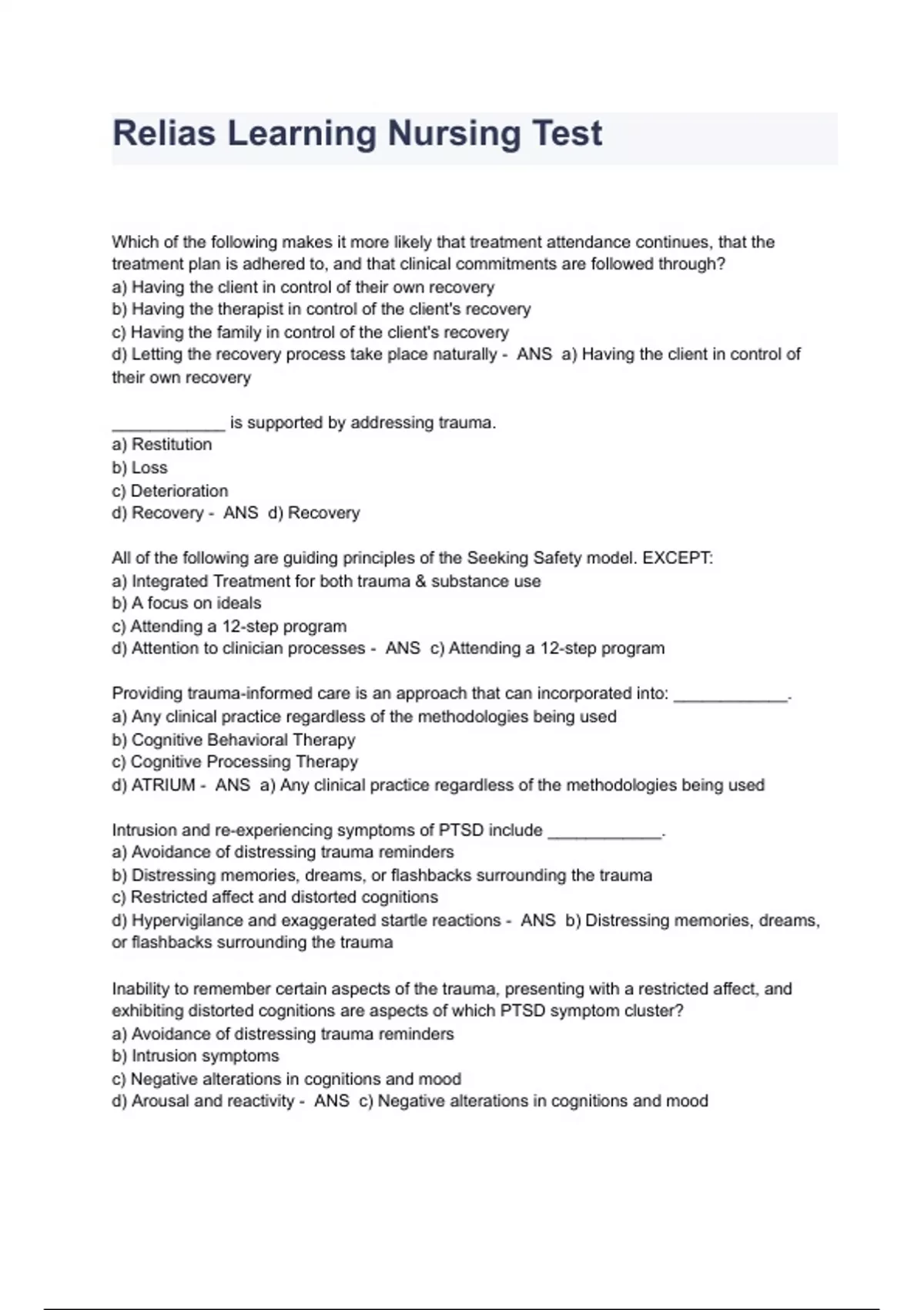 Relias Learning Nursing Test Questions And Answers Which of the following makes it more likely that treatment attendance continues, that the treatment plan is adhered to, and that clinical commitments are followed through? a) Having the client in control of their own recovery b) Having the therapist in control of the client's recovery c) Having the family in control of the client's recovery d) Letting the recovery process take place naturally - ANS a) Having the client in control of their own recovery ____________ is supported by addressing trauma. a) Restitution b) Loss c) Deterioration d) Recovery - ANS d) Recovery All of the following are guiding principles of the Seeking Safety model. EXCEPT: a) Integrated Treatment for both trauma & substance use b) A focus on ideals c) Attending a 12-step program d) Attention to clinician processes - ANS c) Attending a 12-step program Providing trauma-informed care is an approach that can incorporated into: ____________. a) Any clinical practice regardless of the methodologies being used b) Cognitive Behavioral Therapy c) Cognitive Processing Therapy d) ATRIUM - ANS a) Any clinical practice regardless of the methodologies being used Intrusion and re-experiencing symptoms of PTSD include ____________. a) Avoidance of distressing trauma reminders b) Distressing memories, dreams, or flashbacks surrounding the trauma c) Restricted affect and distorted cognitions d) Hypervigilance and exaggerated startle reactions - ANS b) Distressing memories, dreams, or flashbacks surrounding the trauma Inability to remember certain aspects of the trauma, presenting with a restricted affect, and exhibiting distorted cognitions are aspects of which PTSD symptom cluster? a) Avoidance of distressing trauma reminders b) Intrusion symptoms c) Negative alterations in cognitions and mood d) Arousal and reactivity - ANS c) Negative alterations in cognitions and mood When is it most important that the person served feels that the environment is a safe place where they can discuss details of their trauma? a) In outpatient settings b) In residential treatment facilities c) In and inpatient setting d) In all settings - ANS d) In all settings One of the primary goals for treatment in the Seeking Safety model is: a) Stopping self-harm b) Ending substance use once and for all c) Gaining control over minor symptoms d) Maintaining relationships - ANS a) Stopping self-harm True or False: If a person develops resiliency through their childhood and life experiences, the effect of any genetic risks for substance use disorder are greatly increased. a) True b) False - ANS b) False True or False: Trauma increases the the risk of developing substance use problems, while substance use problems increase the likelihood that people will experience trauma. a) True b) False - ANS a) True Repeated use of substances trains the brain's circuits to depend on substances to trigger ____________. a) False positives b) False negatives c) Reward circuitry d) Biofeedback - ANS c) Reward circuitry True or False: Those who had experienced traumatic physical or sexual abuse, or assault, were three times more likely to report substance use disorder than those without trauma. a) True b) False - ANS a) True Motivational interviewing is an opportunity for: a) The therapist to assess for themselves if the benefits of using a specific therapeutic approach b) Clients to assess for themselves the benefits of their specific choices c) Self-improvement as it relates to substance use disorders d) Self-improvement as it relates to posttraumatic stress disorder - ANS b) Clients to assess for themselves the benefits of their specific choice