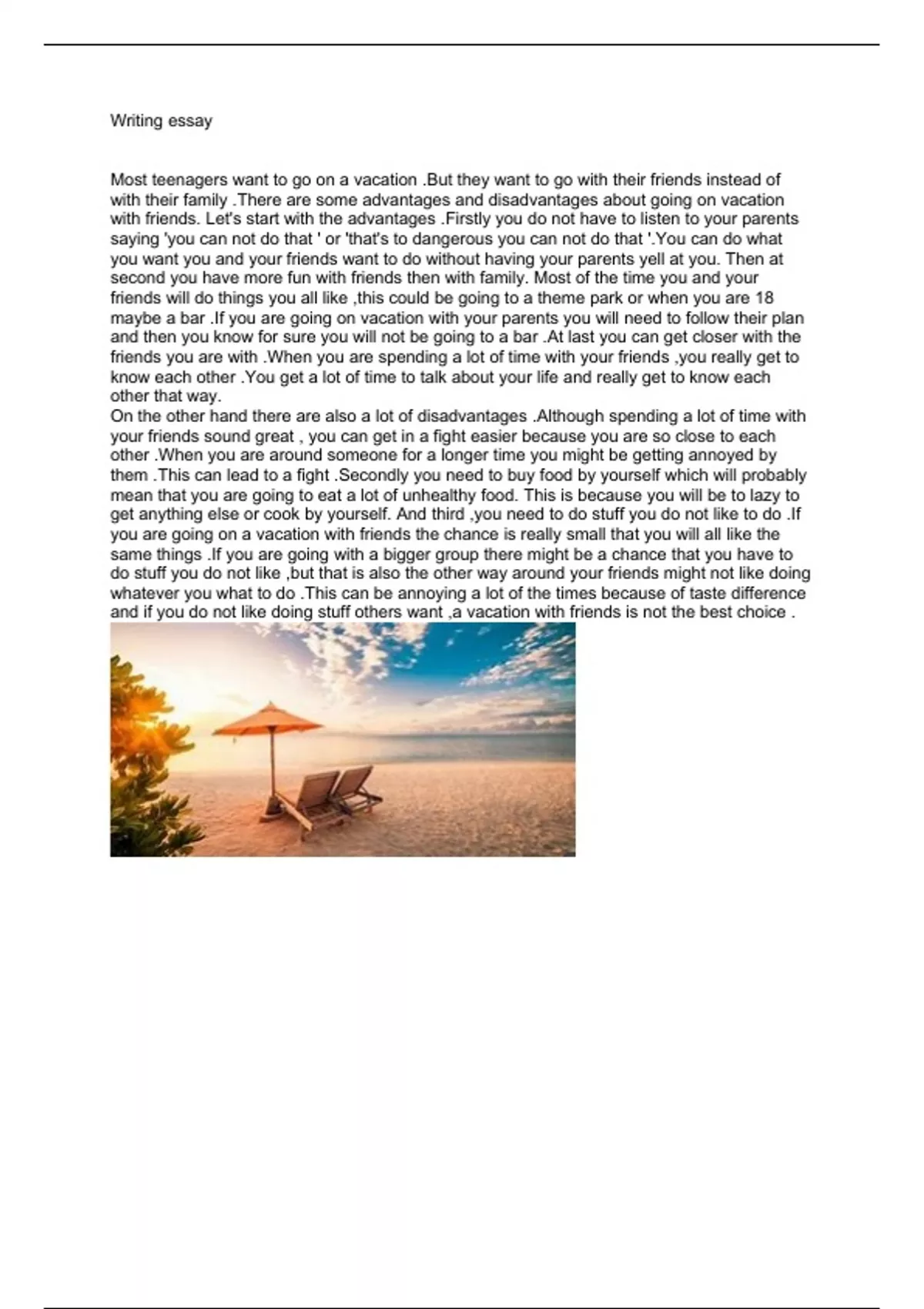 In the document is an essay for writing in English about the pros and cons of going on vacation or hanging out with friends