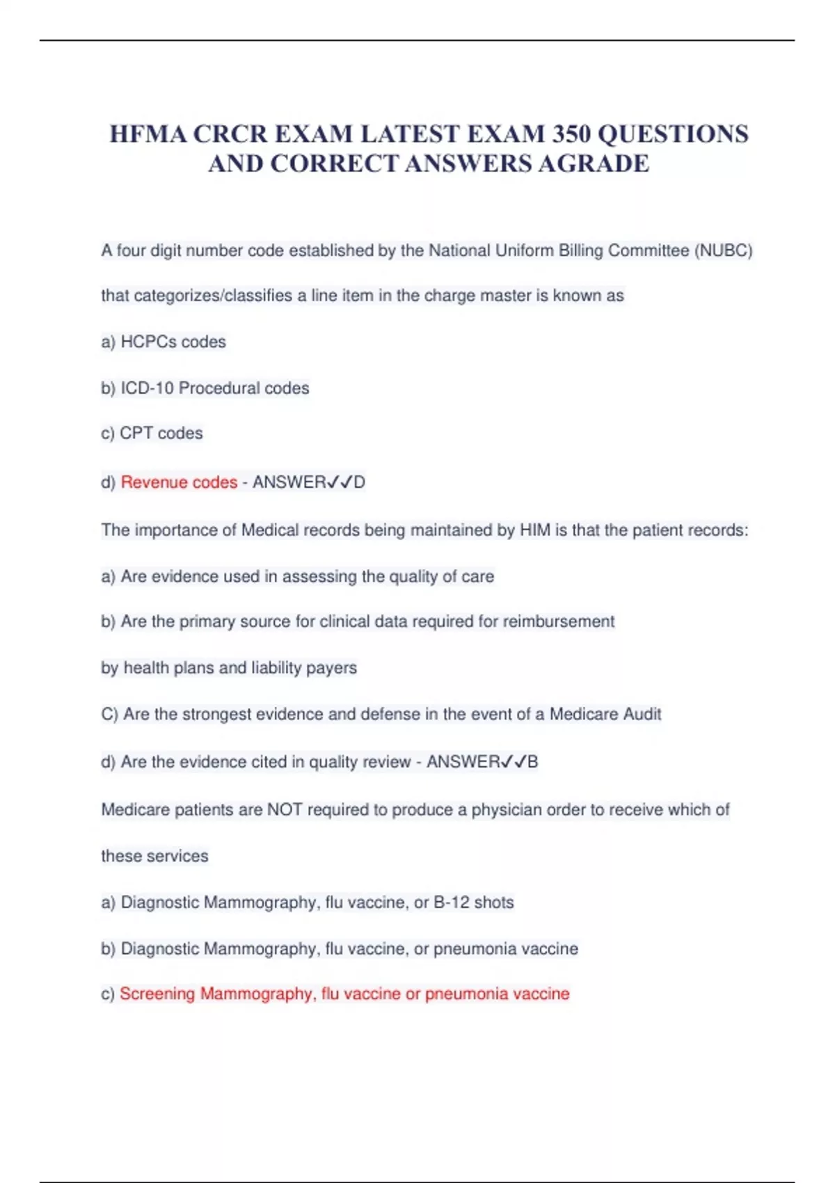 HFMA CRCR EXAM LATEST EXAM QUESTIONS AND CORRECT ANSWERS AGRADE