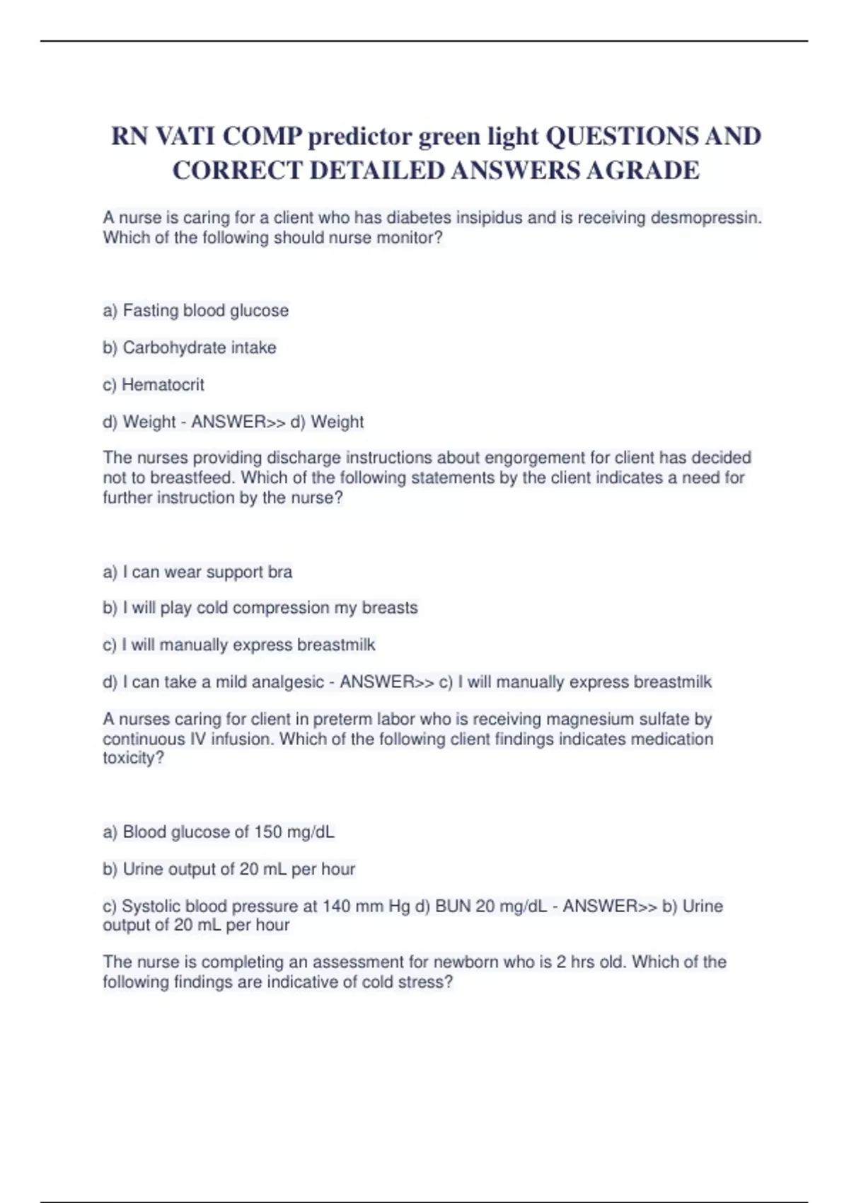 RN VATI COMP predictor green light QUESTIONS AND CORRECT DETAILED ANSWERS AGRADE