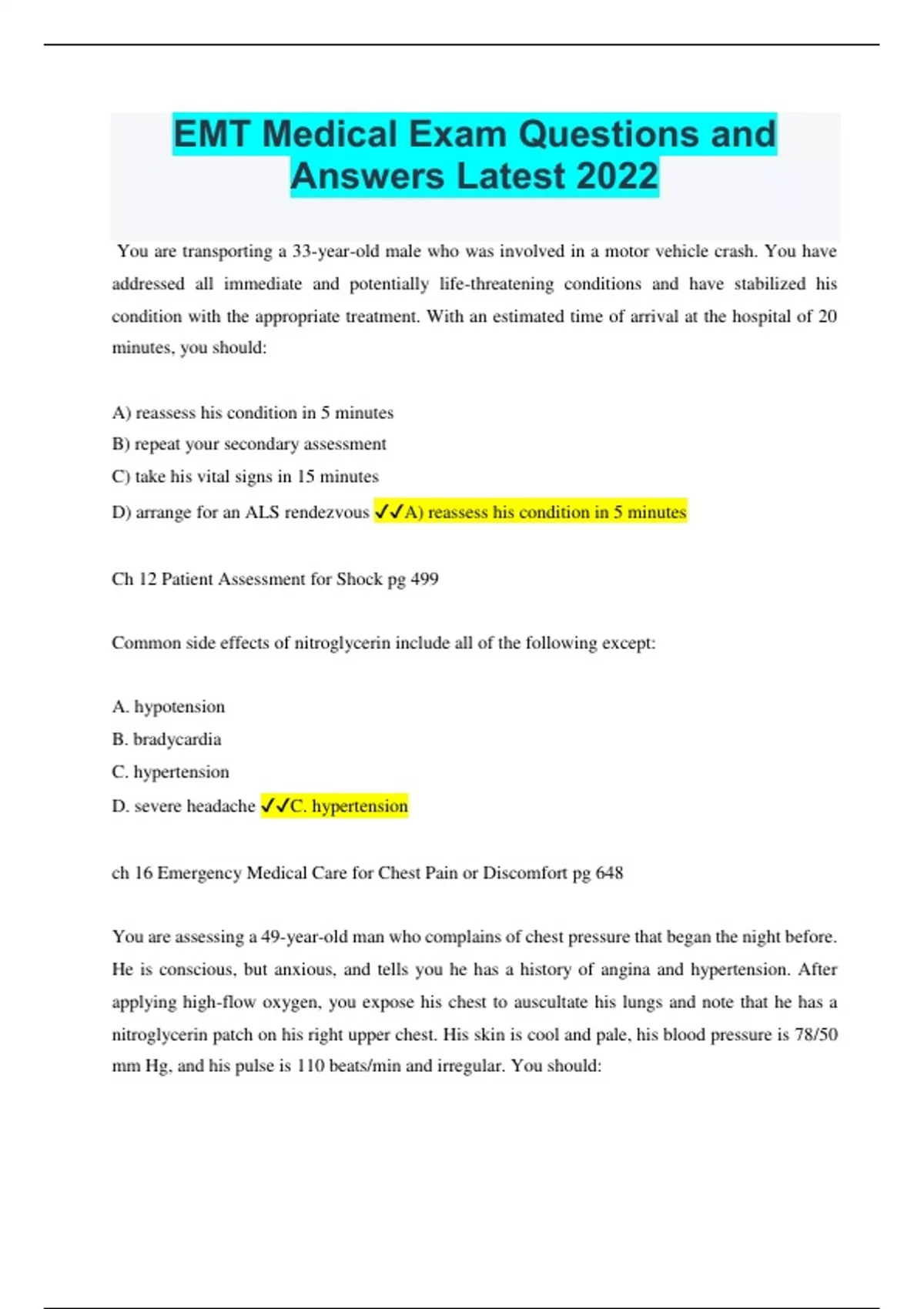 EMT Medical Exam Questions and Answers Latest 2022