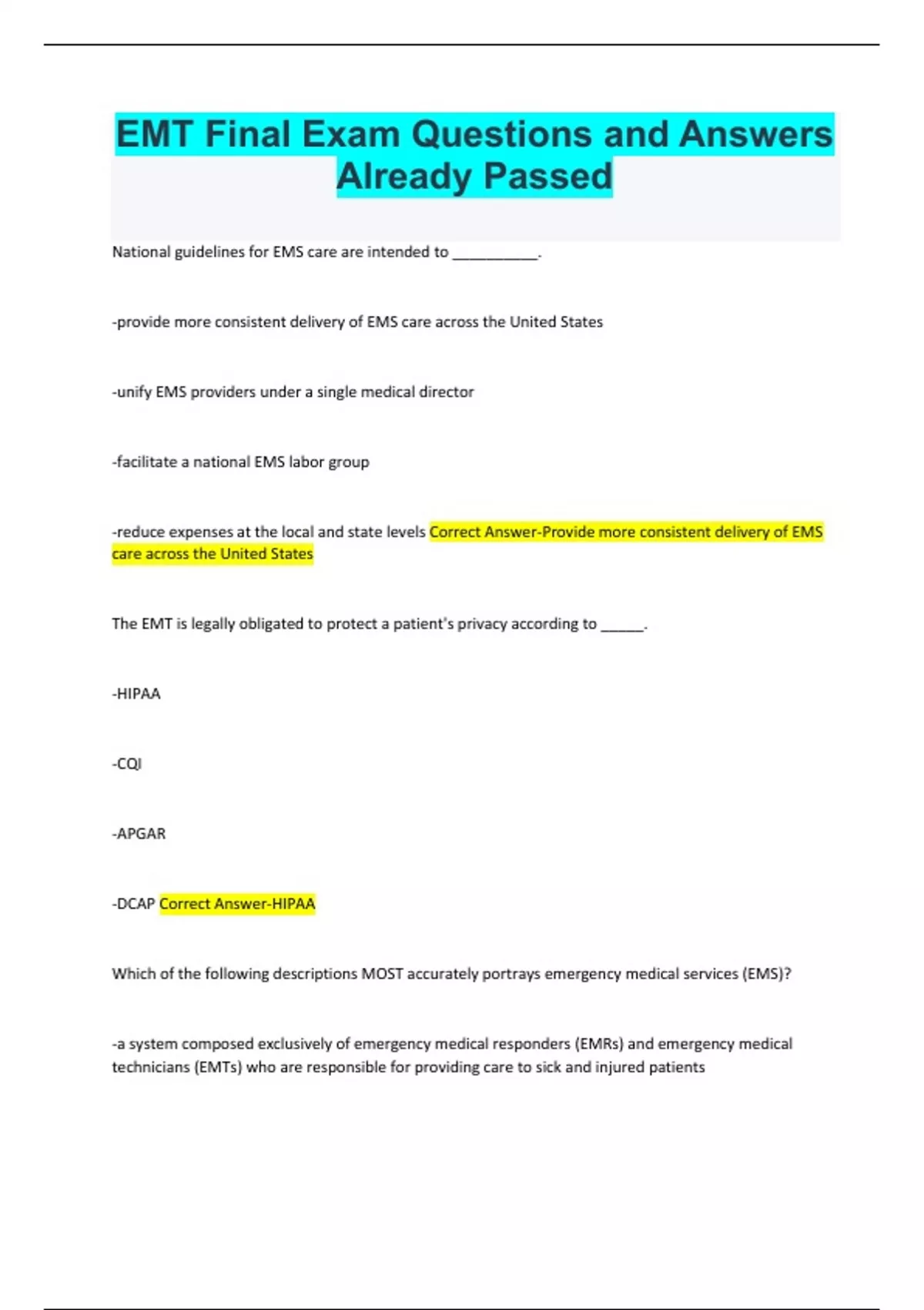 National guidelines for EMS care are intended to __________. -provide more consistent delivery of EMS care across the United States -unify EMS providers under a single medical director -facilitate a national EMS labor group -reduce expenses at the local and state levels Correct Answer-Provide more consistent delivery of EMS care across the United States The EMT is legally obligated to protect a patient's privacy according to _____. -HIPAA -CQI -APGAR -DCAP Correct Answer-HIPAA Which of the following descriptions MOST accurately portrays emergency medical services (EMS)? -a system composed exclusively of emergency medical responders (EMRs) and emergency medical technicians (EMTs) who are responsible for providing care to sick and injured patients -a team of paramedics and emergency physicians who are responsible for providing emergency care to critically injured patients -a vast network of advanced life support (ALS) providers who provide definitive emergency care in the prehospital setting -a team of health care professionals who are responsible for providing emergency care and transportation to the sick and injured Correct Answer-A team of health care professionals who are responsible for providing emergency care and transportation to the sick and injured What is the EMT's primary service area? -the main area in which the EMS agency operates -the area serviced by the EMT's medical director -the location where the EMT provides essential care during a 9-1-1 call -the only area the EMT is certified to provide patient care Correct Answer-the main area in which the EMS agency operates Online medical control requires _____. -written protocols approved by medical control -a physicians presence on the scene of the call -phone or radio contact with the medical director -the presence of an advanced-level provider Correct Answer-phone or radio contact with the medical director