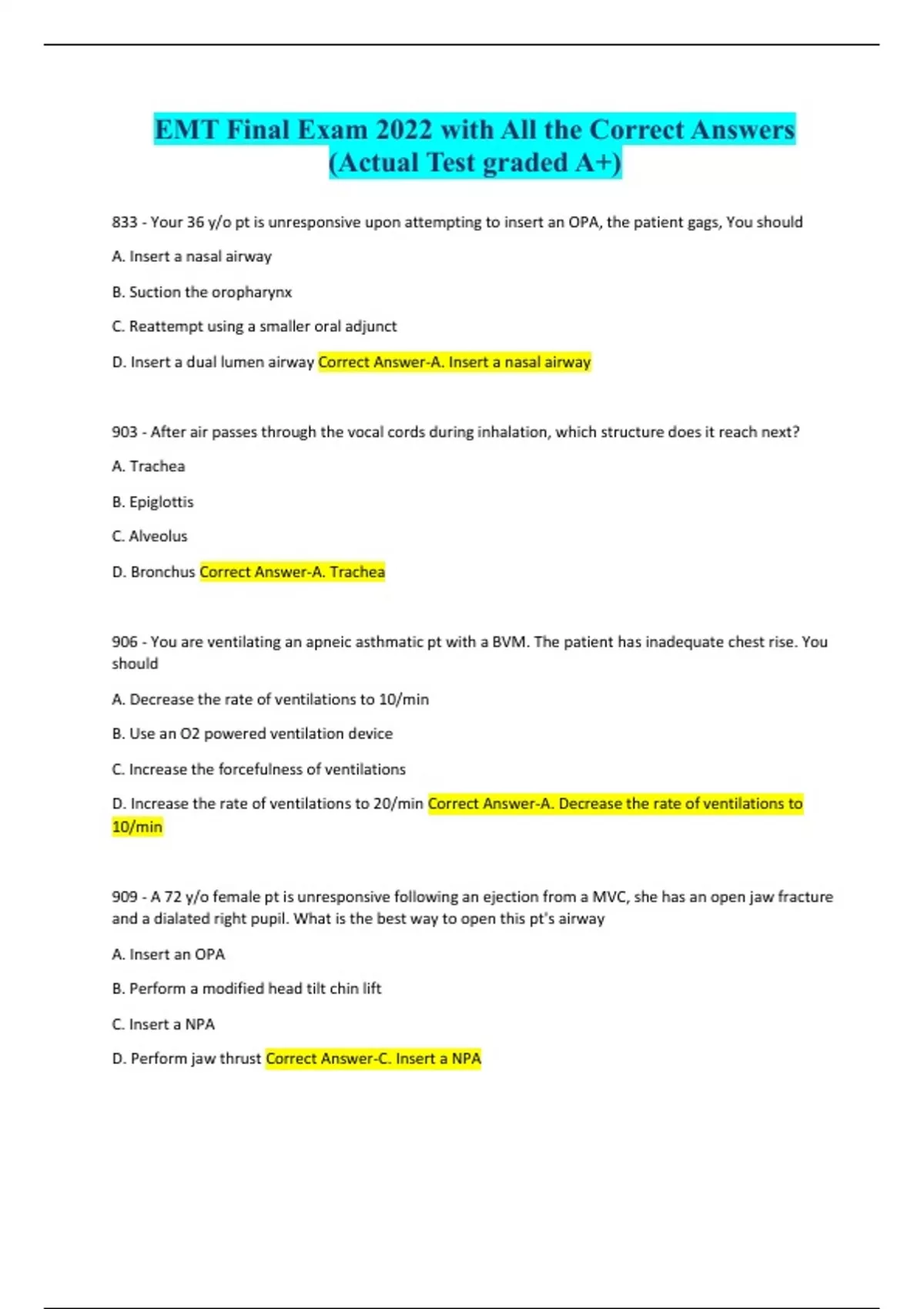 833 - Your 36 y/o pt is unresponsive upon attempting to insert an OPA, the patient gags, You should A. Insert a nasal airway B. Suction the oropharynx C. Reattempt using a smaller oral adjunct D. Insert a dual lumen airway Correct Answer-A. Insert a nasal airway 903 - After air passes through the vocal cords during inhalation, which structure does it reach next? A. Trachea B. Epiglottis C. Alveolus D. Bronchus Correct Answer-A. Trachea 906 - You are ventilating an apneic asthmatic pt with a BVM. The patient has inadequate chest rise. You should A. Decrease the rate of ventilations to 10/min B. Use an O2 powered ventilation device C. Increase the forcefulness of ventilations D. Increase the rate of ventilations to 20/min Correct Answer-A. Decrease the rate of ventilations to 10/min 909 - A 72 y/o female pt is unresponsive following an ejection from a MVC, she has an open jaw fracture and a dialated right pupil. What is the best way to open this pt's airway A. Insert an OPA B. Perform a modified head tilt chin lift C. Insert a NPA D. Perform jaw thrust Correct Answer-C. Insert a NPA
