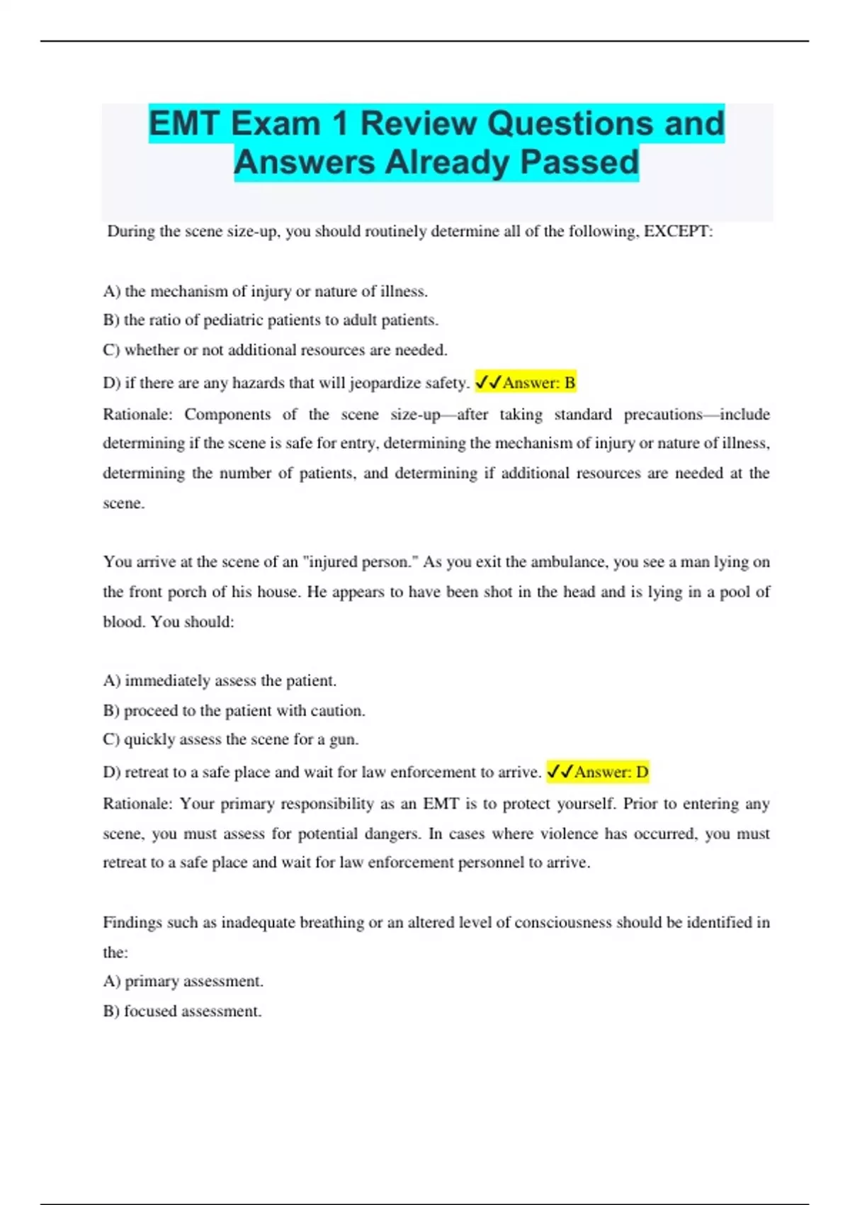 During the scene size-up, you should routinely determine all of the following, EXCEPT: A) the mechanism of injury or nature of illness. B) the ratio of pediatric patients to adult patients. C) whether or not additional resources are needed. D) if there are any hazards that will jeopardize safety. Answer: B Rationale: Components of the scene size-up—after taking standard precautions—include determining if the scene is safe for entry, determining the mechanism of injury or nature of illness, determining the number of patients, and determining if additional resources are needed at the scene. You arrive at the scene of an "injured person." As you exit the ambulance, you see a man lying on the front porch of his house. He appears to have been shot in the head and is lying in a pool of blood. You should: A) immediately assess the patient. B) proceed to the patient with caution. C) quickly assess the scene for a gun. D) retreat to a safe place and wait for law enforcement to arrive. Answer: D Rationale: Your primary responsibility as an EMT is to protect yourself. Prior to entering any scene, you must assess for potential dangers. In cases where violence has occurred, you must retreat to a safe place and wait for law enforcement personnel to arrive. Findings such as inadequate breathing or an altered level of consciousness should be identified in the: A) primary assessment. B) focused assessment.