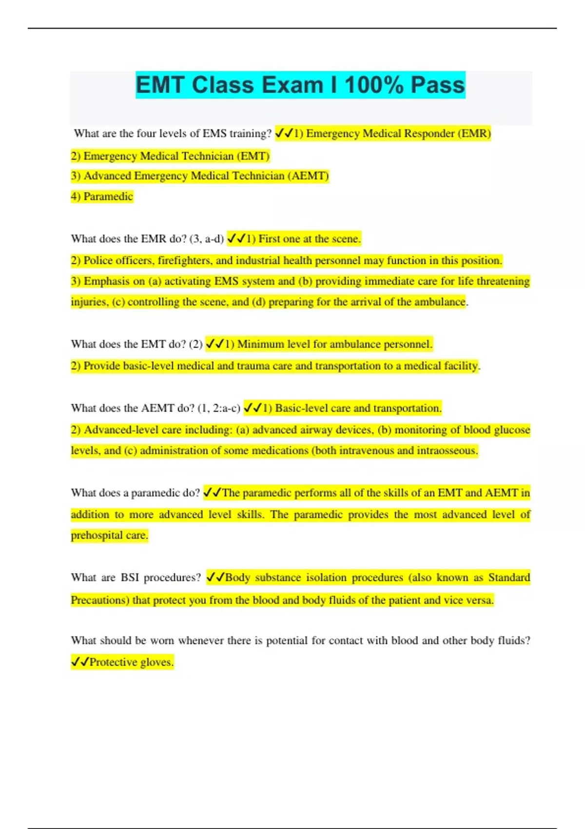 EMT Class Exam I 100% Pass