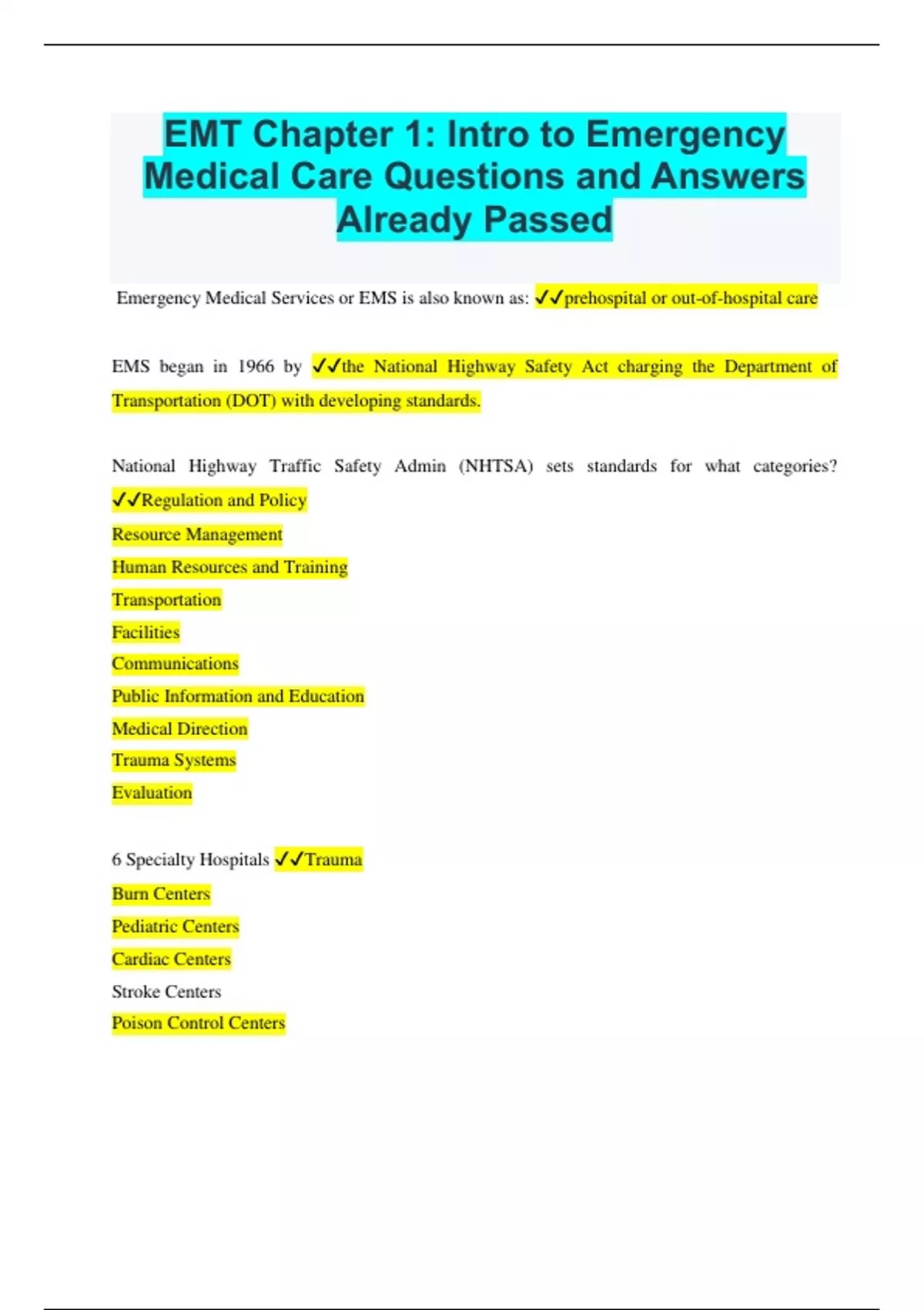 Emergency Medical Services or EMS is also known as: prehospital or out-of-hospital care EMS began in 1966 by the National Highway Safety Act charging the Department of Transportation (DOT) with developing standards. National Highway Traffic Safety Admin (NHTSA) sets standards for what categories? Regulation and Policy Resource Management Human Resources and Training Transportation Facilities Communications Public Information and Education Medical Direction Trauma Systems Evaluation