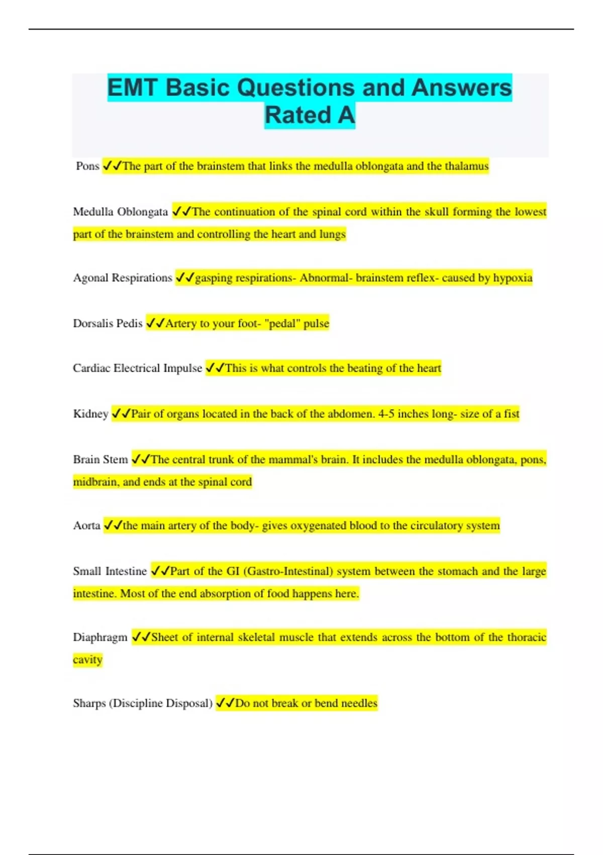 Pons The part of the brainstem that links the medulla oblongata and the thalamus Medulla Oblongata The continuation of the spinal cord within the skull forming the lowest part of the brainstem and controlling the heart and lungs Agonal Respirations gasping respirations- Abnormal- brainstem reflex- caused by hypoxia Dorsalis Pedis Artery to your foot- "pedal" pulse Cardiac Electrical Impulse This is what controls the beating of the heart Kidney Pair of organs located in the back of the abdomen. 4-5 inches long- size of a fist Brain Stem The central trunk of the mammal's brain. It includes the medulla oblongata, pons, midbrain, and ends at the spinal cord Aorta the main artery of the body- gives oxygenated blood to the circulatory system Small Intestine Part of the GI (Gastro-Intestinal) system between the stomach and the large intestine. Most of the end absorption of food happens here. Diaphragm Sheet of internal skeletal muscle that extends across the bottom of the thoracic cavity Sharps (Discipline Disposal) Do not break or bend needles