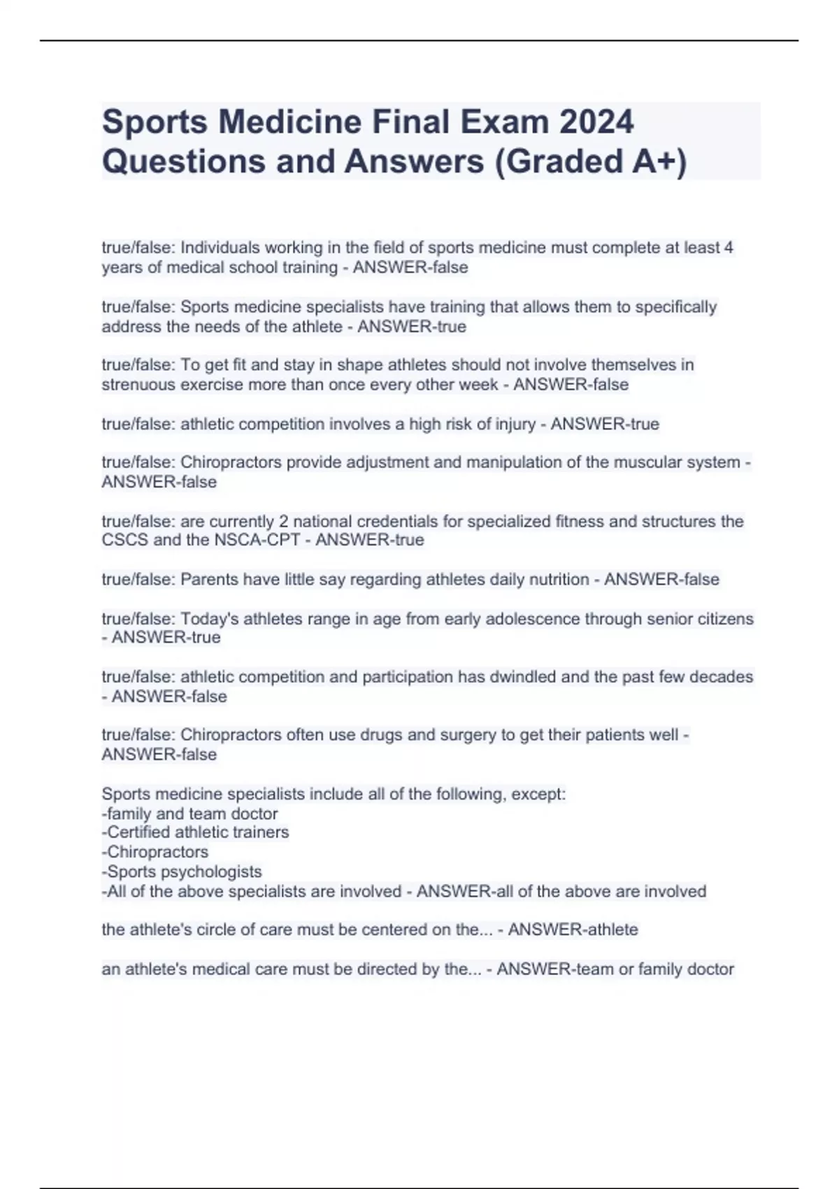 true/false: Individuals working in the field of sports medicine must complete at least 4 years of medical school training - ANSWER-false true/false: Sports medicine specialists have training that allows them to specifically address the needs of the athlete - ANSWER-true true/false: To get fit and stay in shape athletes should not involve themselves in strenuous exercise more than once every other week - ANSWER-false true/false: athletic competition involves a high risk of injury - ANSWER-true true/false: Chiropractors provide adjustment and manipulation of the muscular system - ANSWER-false true/false: are currently 2 national credentials for specialized fitness and structures the CSCS and the NSCA-CPT - ANSWER-true true/false: Parents have little say regarding athletes daily nutrition - ANSWER-false true/false: Today's athletes range in age from early adolescence through senior citizens - ANSWER-true true/false: athletic competition and participation has dwindled and the past few decades - ANSWER-false true/false: Chiropractors often use drugs and surgery to get their patients well - ANSWER-false Sports medicine specialists include all of the following, except: -family and team doctor -Certified athletic trainers -Chiropractors -Sports psychologists -All of the above specialists are involved - ANSWER-all of the above are involved the athlete's circle of care must be centered on the... - ANSWER-athlete an athlete's medical care must be directed by the... - ANSWER-team or family doctor All of the following board certified physician programs provide eligibility for a sub
