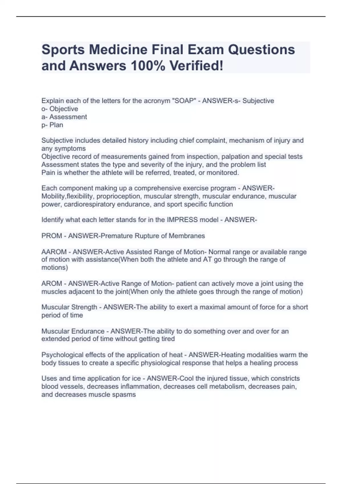 Explain each of the letters for the acronym "SOAP" - ANSWER-s- Subjective o- Objective a- Assessment p- Plan Subjective includes detailed history including chief complaint, mechanism of injury and any symptoms Objective record of measurements gained from inspection, palpation and special tests Assessment states the type and severity of the injury, and the problem list Pain is whether the athlete will be referred, treated, or monitored. Each component making up a comprehensive exercise program - ANSWER-Mobility,flexibility, proprioception, muscular strength, muscular endurance, muscular power, cardiorespiratory endurance, and sport specific function Identify what each letter stands for in the IMPRESS model - ANSWER- PROM - ANSWER-Premature Rupture of Membranes AAROM - ANSWER-Active Assisted Range of Motion- Normal range or available range of motion with assistance(When both the athlete and AT go through the range of motions) AROM - ANSWER-Active Range of Motion- patient can actively move a joint using the muscles adjacent to the joint(When only the athlete goes through the range of motion) Muscular Strength - ANSWER-The ability to exert a maximal amount of force for a short period of time Muscular Endurance - ANSWER-The ability to do something over and over for an extended period of time without getting tired Psychological effects of the application of heat - ANSWER-Heating modalities warm the body tissues to create a specific physiological response that helps a healing process Uses and time application for ice - ANSWER-Cool the injured tissue, which constricts blood vessels, decreases inflammation, decreases cell metabolism, decreases pain, and decreases muscle spasms Administer ultrasound for maximal effectiveness - ANSWER-Produces a deep-heating effect