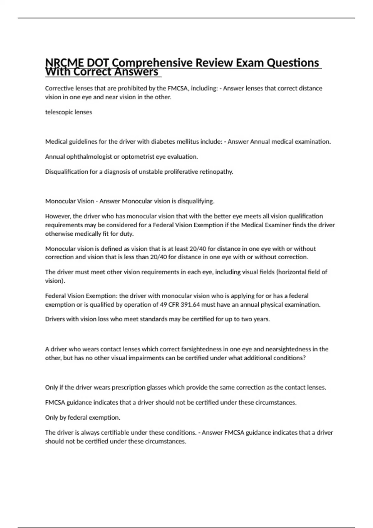 NRCME DOT Comprehensive Review Exam Questions With Correct Answers