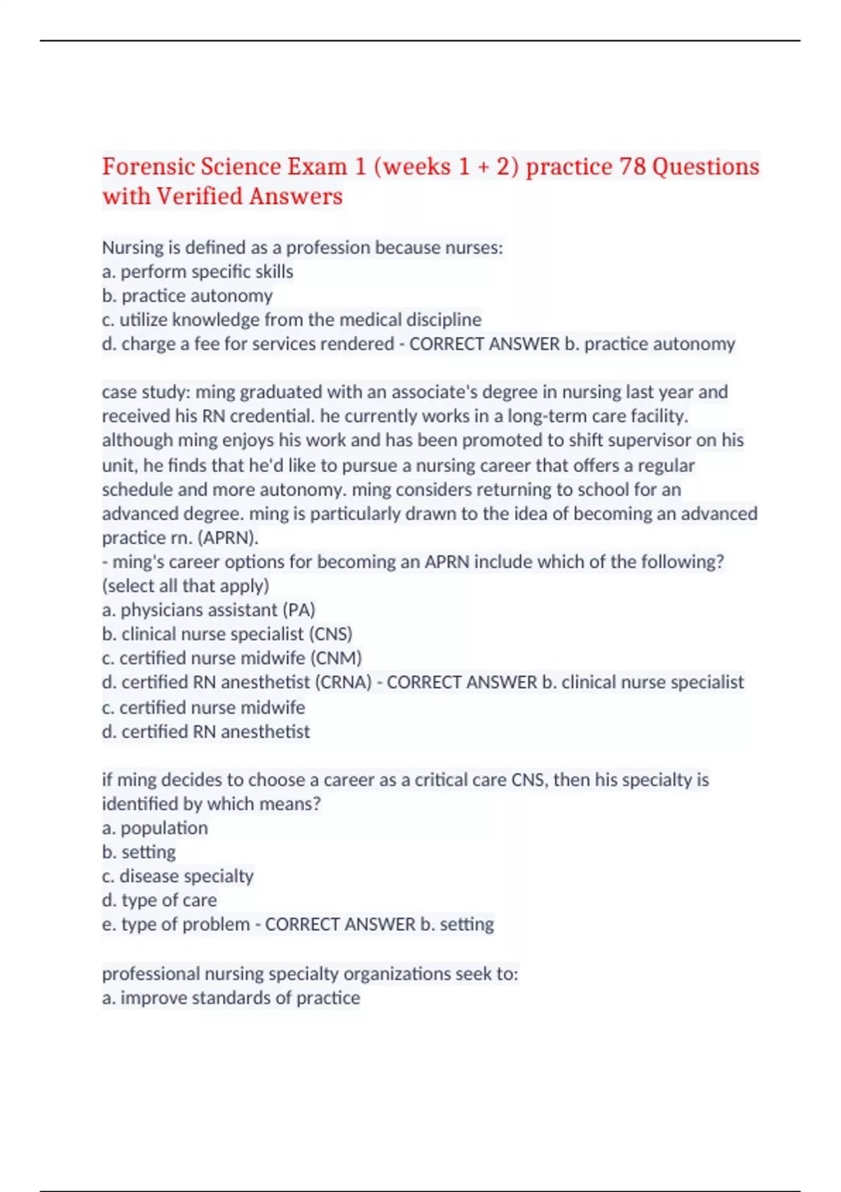 Forensic Science Exam 1 (weeks 1 + 2) practice 78 Questions with Verified Answers Nursing is defined as a profession because nurses: a. perform specific skills b. practice autonomy c. utilize knowledge from the medical discipline d. charge a fee for services rendered - CORRECT ANSWER b. practice autonomy case study: ming graduated with an associate's degree in nursing last year and received his RN credential. he currently works in a long-term care facility. although ming enjoys his work and has been promoted to shift supervisor on his unit, he finds that he'd like to pursue a nursing career that offers a regular schedule and more autonomy. ming considers returning to school for an advanced degree. ming is particularly drawn to the idea of becoming an advanced practice rn. (APRN). - ming's career options for becoming an APRN include which of the following? (select all that apply) a. physicians assistant (PA) b. clinical nurse specialist (CNS) c. certified nurse midwife (CNM) d. certified RN anesthetist (CRNA) - CORRECT ANSWER b. clinical nurse specialist c. certified nurse midwife d. certified RN anesthetist if ming decides to choose a career as a critical care CNS, then his specialty is identified by which means? a. population b. setting c. disease specialty d. type of care e. type of problem - CORRECT ANSWER b. setting professional nursing specialty organizations seek to: a. improve standards of practice b. expand nursing roles c. improve the welfare of nurses in specialty areas d. all of the above - CORRECT ANSWER d. all of the above you are invited to attend the weekly unit patient care conference. the staff discusses patient care issues. this type of communication is: a. public b. intrapersonal c. transpersonal d. small group - CORRECT ANSWER d. small group helping relationships serve as the foundation of clinical nursing practice. contracts for a therapeutic helping relationship are formed during the: a. orientation phase b. working stage c. termination phase d. preinteraction phase - CORRECT ANSWER a. orientation phase while admitting a patient, during the initial interview, a family member tells you, " my mom really means that she does not understand her medical diagnosis." the communication form used by the family member is: a. focusing b. clarifying c. summarizing d. paraphrasing - CORRECT ANSWER b. clarifying you are caring for a non-english speaking male patient. when preparing to assist him with personal hygiene, you should: a. use soap and water on all types of skin b. ensure that culture and ethnicity influence hygiene practices c. shave facial hair to make the patient more comfortable d. know that all patients need to be bathed daily - CORRECT ANSWER b. ensure that culture and ethnicity influence hygiene practices a young girl with long hair is experiencing a problem with matting. the most appropriate action to take would be: a. cutting the matted hair away b. braiding the hair to reduce tangles c. using a grease-type product to tame the hair d. keeping the hair oil free by applying powder every morning - CORRECT ANSWER b. braiding the hair to reduce tangles a patient is admitted to a medical unit for a home-acquired pressure ulcer. the patient has alzheimer's disease and has been incontinent of urine. the nurse inserts a foley catheter. you will identify a link in the infection chain as: a. restraints b. poor hygiene c. foley catheter bag d. improper positioning - CORRECT ANSWER c. foley catheter bag you are caring for a patient who underwent surgery 48 hours ago. on physical assessment, you notice that the wound looks red and swollen. the patient's WBCs are elevated. you should: a. start antibiotics b. notify the provider c. document the findings and reasses in 2 hours d. place the patient on isolation precautions - CORRECT ANSWER b. notify the provider while caring for a child, you identify that additional safety teaching is needed when a young and inexperienced mother states that: a. teenagers need to practice safe sex b. a 3 year old can safely sit in the front seat of the car c. children need to wear safety equipment when bike riding d. children need to learn to swim even if they do not have a pool - CORRECT ANSWER b. a 3 year old can safely sit in the front seat of the car a newly admitted patient was found wandering the hallways for the past two nights. the most appropriate nursing interventions to prevent a fall for this patient would include: a. raise all four side rails when darkness falls b. use an electronic bed monitoring device c. place the patient in a room close to the nursing station d. use a loose-fitting vest-type jacket restraint - CORRECT ANSWER b. use an electronic bed monitoring device a nurse floats to a busy surgical unit and administers a wrong medication to a patient. this error can be classified as: a. a poisoning accident b. an equipment-related accident c. a procedure-related accident d. an accident related to time management - CORRECT ANSWER c. a procedure-related accident an athletic young woman has just fractured her leg while training for a marathon. the use of meditation has many physiological priorities that will help the young woman to: a. raise blood pressure b. increase mood swings c. increase oxygen consumption d. lower muscle tension - CORRECT ANSWER d. lower muscle tension you are preparing a presentation for your classmates regarding the clinical care coordination conference for a patient with terminal cancer. as part of the preparation you have your classmates read the Nursing Code of Ethics for Professional Registered Nurses. your instructor asks the class why this document is important. which statement best describes this code? a. improves self-health care b. protects the patient's confidentiality c. ensures identical care to all patients d. defines the principles of right and wrong to provide patient care - CORRECT ANSWER d. defines the principles of right and wrong to provide patient care a nurse is caring for a patient with