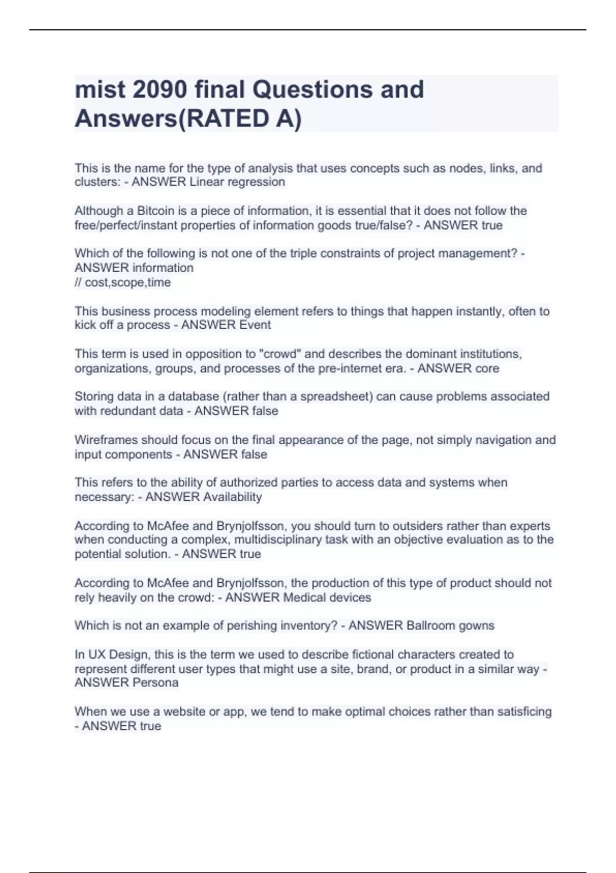 mist 2090 final Questions and Answers(RATED A) This is the name for the type of analysis that uses concepts such as nodes, links, and clusters: - ANSWER Linear regression Although a Bitcoin is a piece of information, it is essential that it does not follow the free/perfect/instant properties of information goods true/false? - ANSWER true Which of the following is not one of the triple constraints of project management? - ANSWER information // cost,scope,time This business process modeling element refers to things that happen instantly, often to kick off a process - ANSWER Event This term is used in opposition to "crowd" and describes the dominant institutions, organizations, groups, and processes of the pre-internet era. - ANSWER core Storing data in a database (rather than a spreadsheet) can cause problems associated with redundant data - ANSWER false Wireframes should focus on the final appearance of the page, not simply navigation and input components - ANSWER false This refers to the ability of authorized parties to access data and systems when necessary: - ANSWER Availability According to McAfee and Brynjolfsson, you should turn to outsiders rather than experts when conducting a complex, multidisciplinary task with an objective evaluation as to the