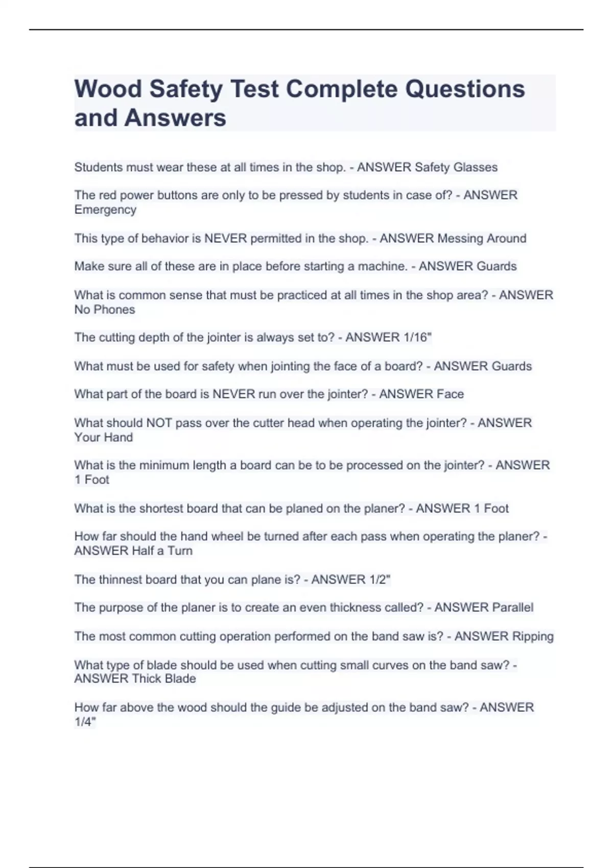 Wood Safety Test Complete QuStudents must wear these at all times in the shop. - ANSWER Safety Glasses The red power buttons are only to be pressed by students in case of? - ANSWER Emergency This type of behavior is NEVER permitted in the shop. - ANSWER Messing Around Make sure all of these are in place before starting a machine. - ANSWER Guards What is common sense that must be practiced at all times in the shop area? - ANSWER No Phones The cutting depth of the jointer is always set to? - ANSWER 1/16" estions and Answers