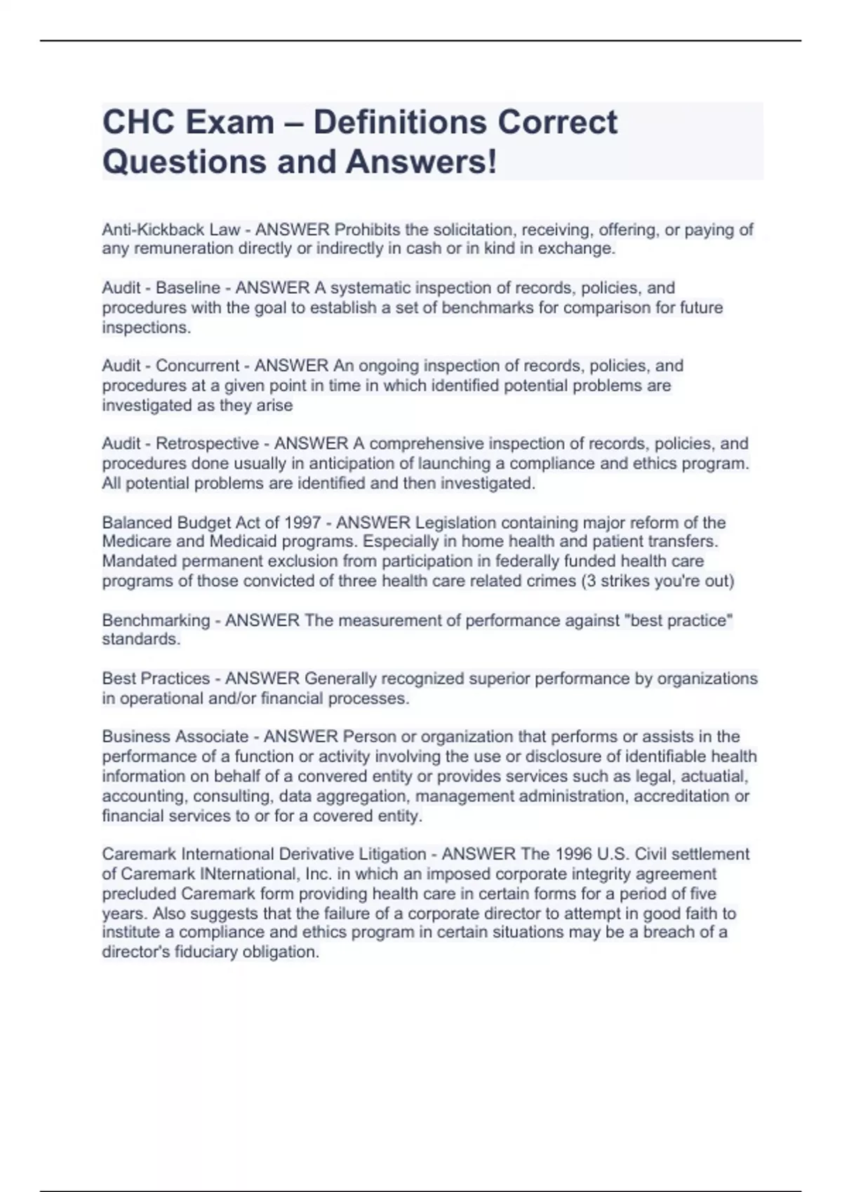 CHC Exam – Definitions Correct Questions and Answers! Anti-Kickback Law - ANSWER Prohibits the solicitation, receiving, offering, or paying of any remuneration directly or indirectly in cash or in kind in exchange. Audit - Baseline - ANSWER A systematic inspection of records, policies, and procedures with the goal to establish a set of benchmarks for comparison for future inspections. Audit - Concurrent - ANSWER An ongoing inspection of records, policies, and procedures at a given point in time in which identified potential problems are investigated as they arise Audit - Retrospective - ANSWER A comprehensive inspection of records, policies, and procedures done usually in anticipation of launching a compliance and ethics program. All potential problems are identified and then investigated. Balanced Budget Act of 1997 - ANSWER Legislation containing major reform of the Medicare and Medicaid programs. Especially in home health and patient transfers. Mandated permanent exclusion from participation in federally funded health care programs of those convicted of three health care related crimes (3 strikes you're out) Benchmarking - ANSWER The measurement of performance against "best practice" standards. Best Practices - ANSWER Generally recognized superior performance by organizations in operational and/or financial processes. Business Associate - ANSWER Person or organization that performs or assists in the performance of a function or activity involving the use or disclosure of identifiable health information on behalf of a convered entity or provides services such as legal, actuatial, accounting, consulting, data aggregation, management administration, accreditation or financial services to or for a covered entity. Caremark International Derivative Litigation - ANSWER The 1996 U.S. Civil settlement of Caremark INternational, Inc. in which an imposed corporate integrity agreement precluded Caremark form providing health care in certain forms for a period of five years. Also suggests that the failure of a corporate director to attempt in good faith to institute a compliance and ethics program in certain situations may be a breach of a director's fiduciary obligation.