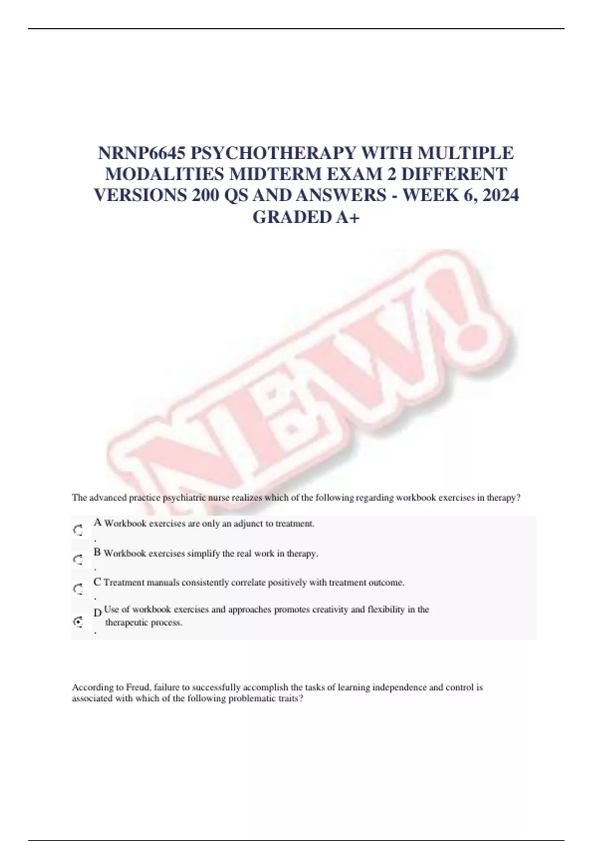NRNP6645 PSYCHOTHERAPY WITH MULTIPLE MODALITIES MIDTERM EXAM 2 DIFFERENT VERSIONS 200 QS AND ANSWERS -