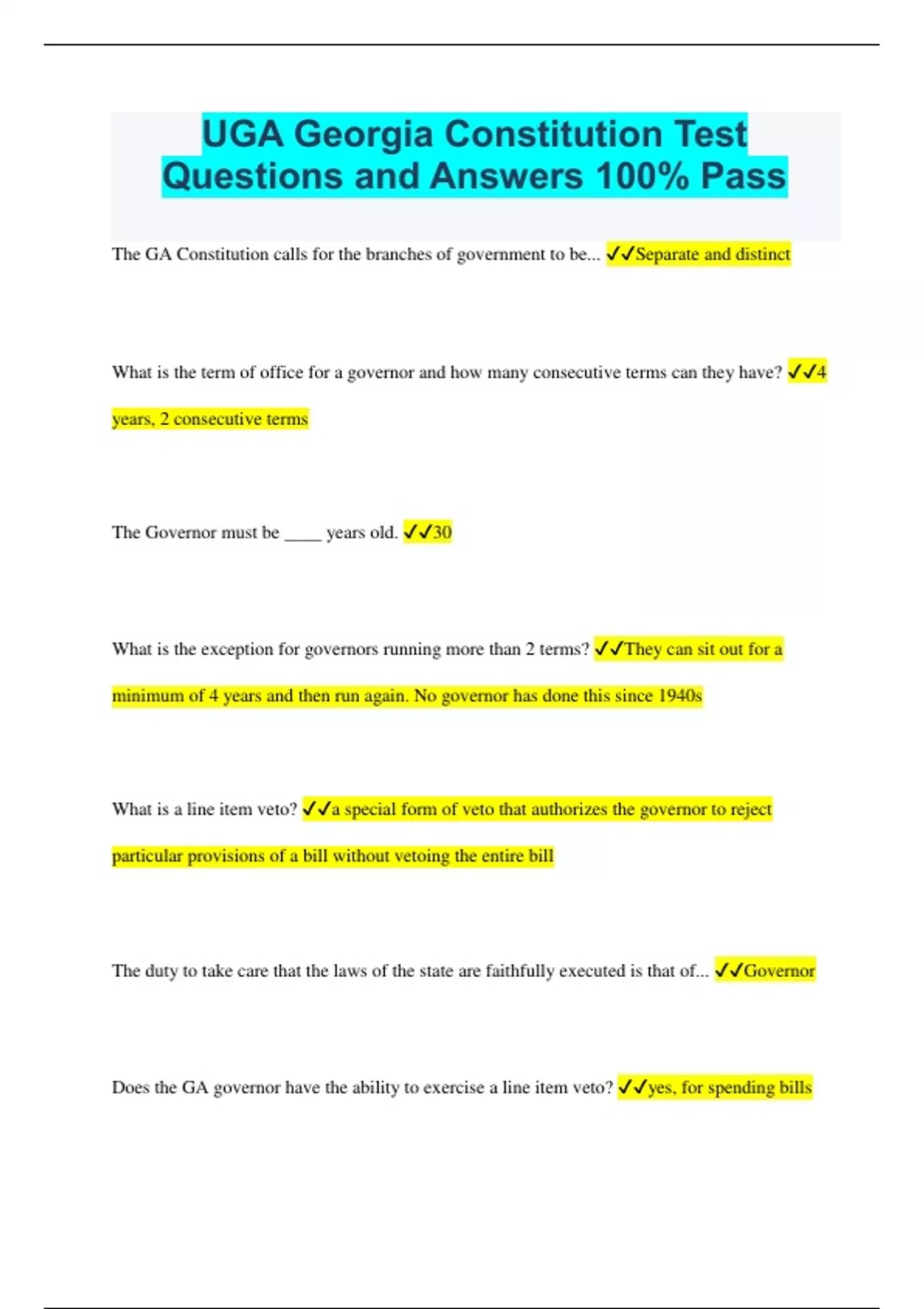 UGA Georgia Constitution Test Questions and Answers 100% Pass The GA Constitution calls for the branches of government to be... Separate and distinct What is the term of office for a governor and how many consecutive terms can they have? 4 years, 2 consecutive terms The Governor must be ____ years old. 30 What is the exception for governors running more than 2 terms? They can sit out for a minimum of 4 years and then run again. No governor has done this since 1940s What is a line item veto? a special form of veto that authorizes the governor to reject particular provisions of a bill without vetoing the entire bill The duty to take care that the laws of the state are faithfully executed is that of... Governor Does the GA governor have the ability to exercise a line item veto? yes, for spending bills How can a line item veto be overridden? 2/3 vote from the General Assembly Who has the power of executive clemency in the Georgia Constitution? State Board of Pardons and Paroles Executive Clemency gives the power to grant... reprieves, pardons, and paroles. What are the qualifications for members of The US House? 1) at least 25 y/o 2) US citizen >7 years 3) live in the state they represent What are the qualifications for US Senators? 1) at least 30 y/o 2) US citizen >9 years 3) live in the state they represent What are the qualifications for members of The Georgia House? 1) at least 21 y/o 2) US citizen 3) GA citizen for 2 years 4) legal resident of district for 1 year What are the qualifications for members of The Georgia Senate? 1) at least 25 y/o 2) US citizen 3) GA citizen for 2 years 4) legal resident of district for 1 year The terms of Senators and Reps are ____ and have _____ on number of terms 2 years, no limit All bills raising revenue or appropriating money must originate in... The House Votes on bills in the General Assembly must always be by ______ if a bill involves _______. Roll call, appropriations The presiding officer of the House of Reps is... Speaker What is the main purpose (2) of the Lieutenant Governor? President of the Senate, successor of the Governor What duty did Marvin Griffin propose for the Lieutenant Governor? Appointing chairmen to senate committees w/ governor approval In 2003, Governor Sonny Perdue stripped the Lieutenant Governor of Griffin's powers and gave them to ____________. President Pro Tempore