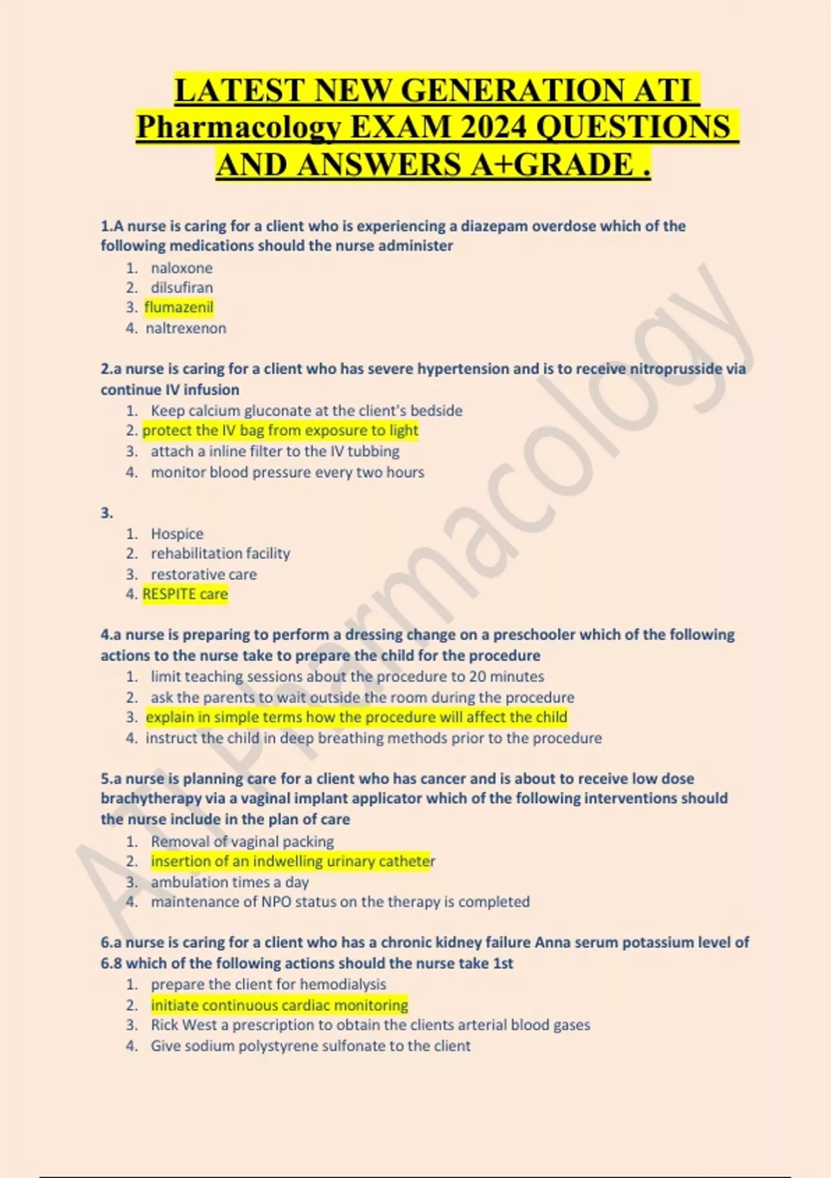LATEST NEW GENERATION ATI Pharmacology EXAM 2024 QUESTIONS AND ANSWERS A+GRADE . 1.A nurse is caring for a client who is experiencing a diazepam overdose which of the following medications should the nurse administer one firan zenil exenon 2.a nurse is caring for a client who has severe hypertension and is to receive nitroprusside via continue IV infusion 1.Keep calcium gluconate at the client's bedside ct the IV bag from exposure to light h a inline filter to the IV tubbing or blood pressure every two hours 3. 1.Hospice ilitation facility rative care 4.RESPITE care e is preparing to perform a dressing change on a preschooler which of the following actions to the nurse take to prepare the child for the procedure teaching sessions about the procedure to 20 minutes the parents to wait outside the room during the procedure in in simple terms how the procedure will affect the child uct the child in deep breathing methods prior to the procedure 5.a nurse is planning care for a client who has cancer and is about to receive low dose brachytherapy via a vaginal implant applicator which of the following interventions should the nurse include in the plan of care 1.Removal of vaginal packing tion of an indwelling urinary catheter ation times a day enance of NPO status on the therapy is completed 6.a nurse is caring for a client who has a chronic kidney failure Anna serum potassium level of 6.8 which of the following actions should the nurse take 1st re the client for hemodialysis ate continuous cardiac monitoring 3.Rick West a prescription to obtain the clients arterial blood gases 4.Give sodium polystyrene sulfonate to the client SKPASS GREAT STUDIES 7.A nurse on a medical surgical unit is caring for a client who states that she plans to leave the facility against medical advice for which of the following actions by the nurse should the charge nurse intervene (OJO this is a negative question) the client to sign a form releasing the hospital from legal responsibility the client her abnormal lab values the client what her plans are for follow up care security to detain decline until the provider is notified 8.a nurse is assessing a client who is 2 hours postpartum for uterine atony which of the following actions should the nurse take or the clients urinary output 2.Palpate he clients fundus the client's vital signs ate the clients pain level 9.a nurse is providing prenatal teaching to a client who is 12 weeks gestation the nurse should tell the client that she will undergo which of the following screening tests at 16 weeks of gestation ic villus sampling stress test nal serum Alpha fetoprotein cal cultures for chlamydia 10.a nurse is assisting with food selection for a client who follows kosher dietary traditions which of the following food choices should the nurse include in a client food tray and cheese Quiche with milk bled eggs and toast with milk sandwich with milk p salad and tomato soup with milk 11.a nurse is assessing a client who is pregnant and has a new diagnosis of hyperemesis gravidarum which of the following findings should the nurse expect output 20 milliliters per hour t gain of 2kg nded neck veins ted blood pressure 12.a nurse is providing discharge teaching for a client who
