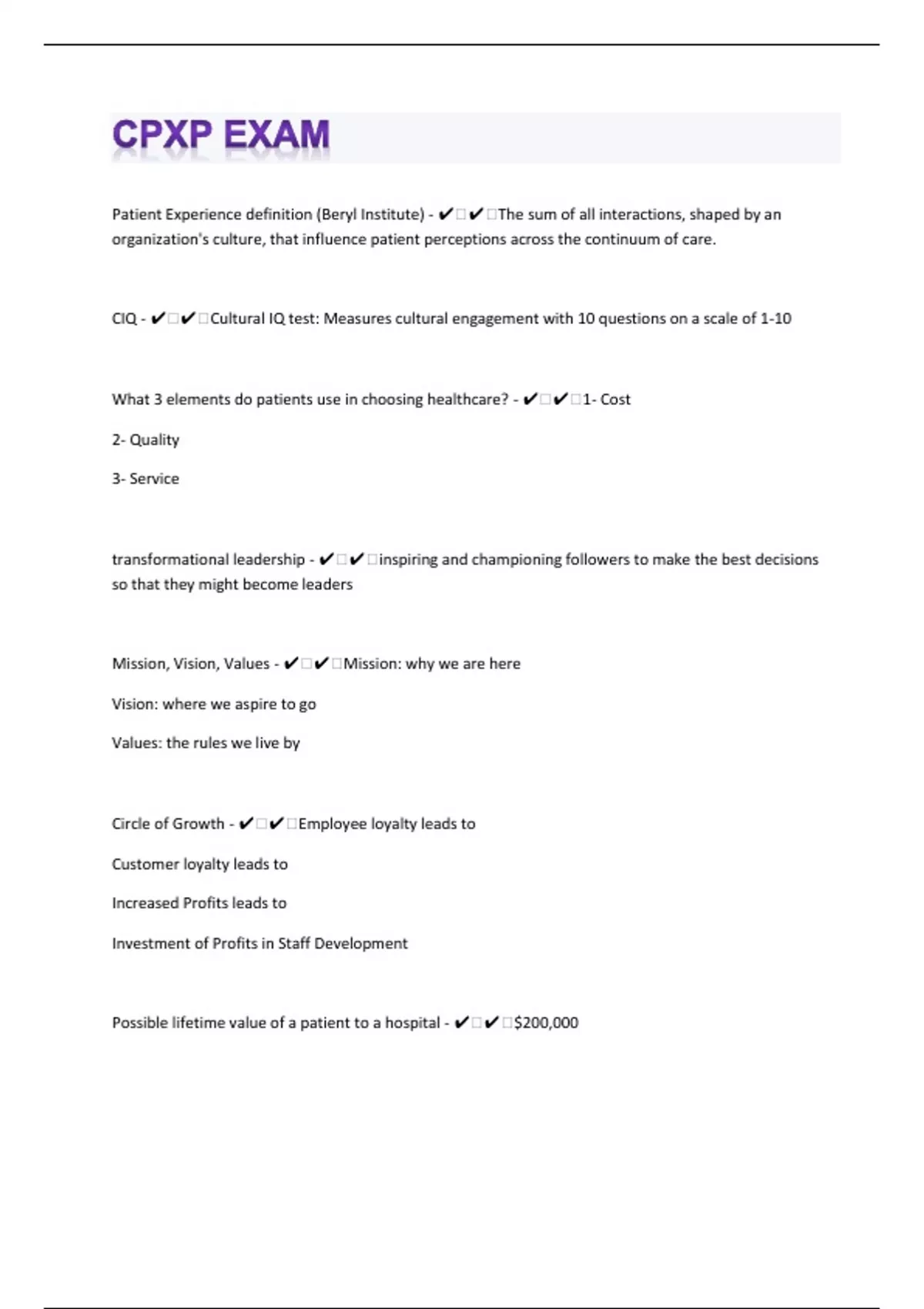 Patient Experience definition (Beryl Institute) - ️️The sum of all interactions, shaped by an organization's culture, that influence patient perceptions across the continuum of care. CIQ - ️️Cultural IQ test: Measures cultural engagement with 10 questions on a scale of 1-10 What 3 elements do patients use in choosing healthcare? - ️️1- Cost 2- Quality 3- Service transformational leadership - ️️inspiring and championing followers to make the best decisions so that they might become leaders Mission, Vision, Values - ️️Mission: why we are here Vision: where we aspire to go Values: the rules we live by Circle of Growth - ️️Employee loyalty leads to Customer loyalty leads to Increased Profits leads to Investment of Profits in Staff Development Possible lifetime value of a patient to a hospital - ️️$200,000
