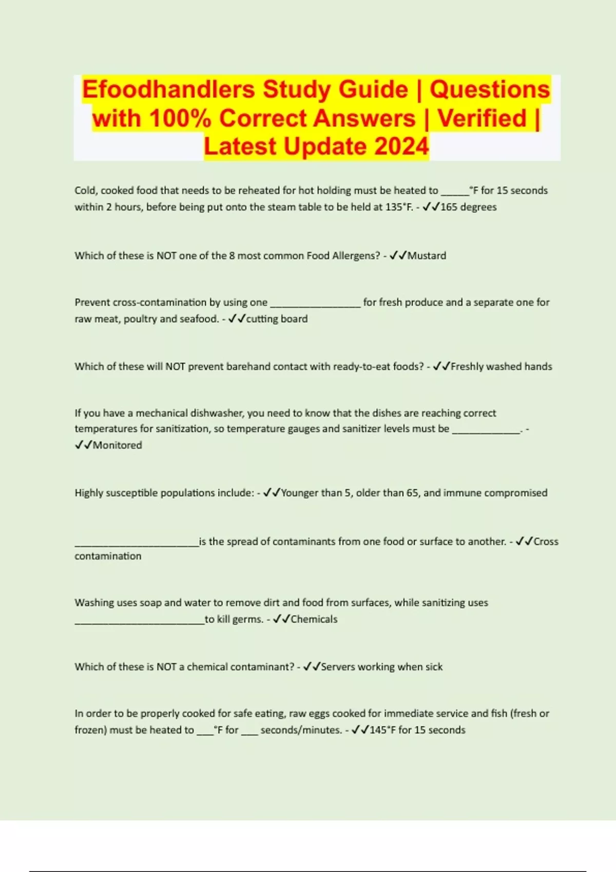 Efoodhandlers Study Guide | Questions with 100% Correct Answers | Verified | Latest Update 2024
