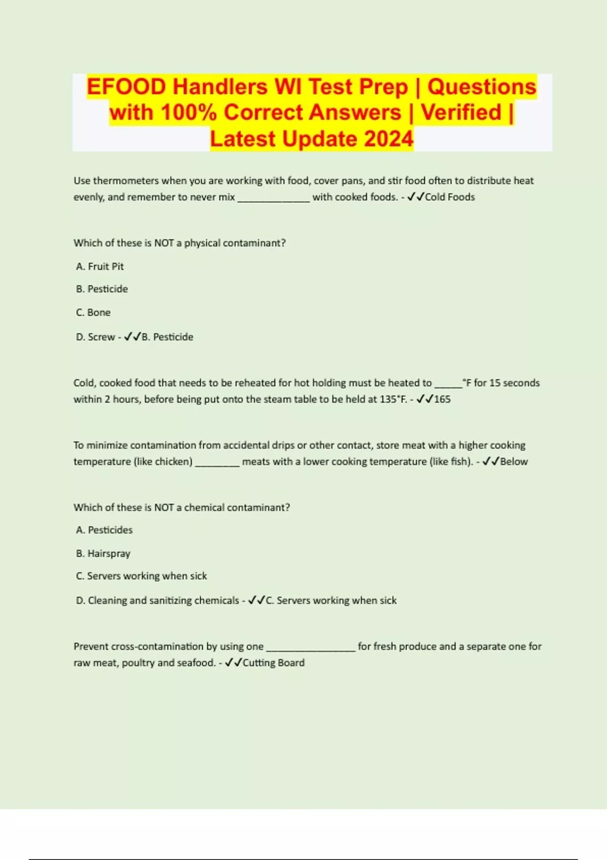 EFOOD Handlers WI Test Prep | Questions with 100% Correct Answers | Verified | Latest Update 2024