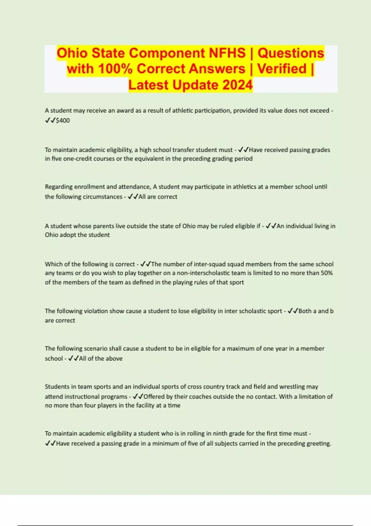Ohio State Component NFHS | Questions with 100% Correct Answers | Verified | Latest Update 2024