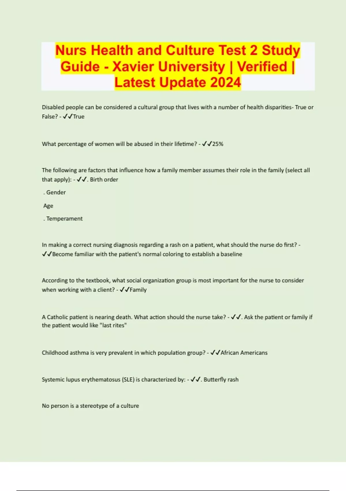 Nurs Health and Culture Test 2 Study Guide - Xavier University | Verified | Latest Update 2024