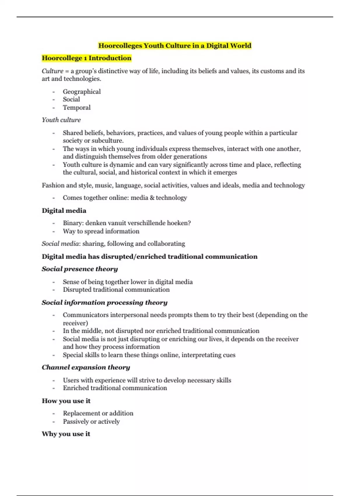 Alle college aantekeningen van het vak Youth Culture in a Digital World uitgewerkt.