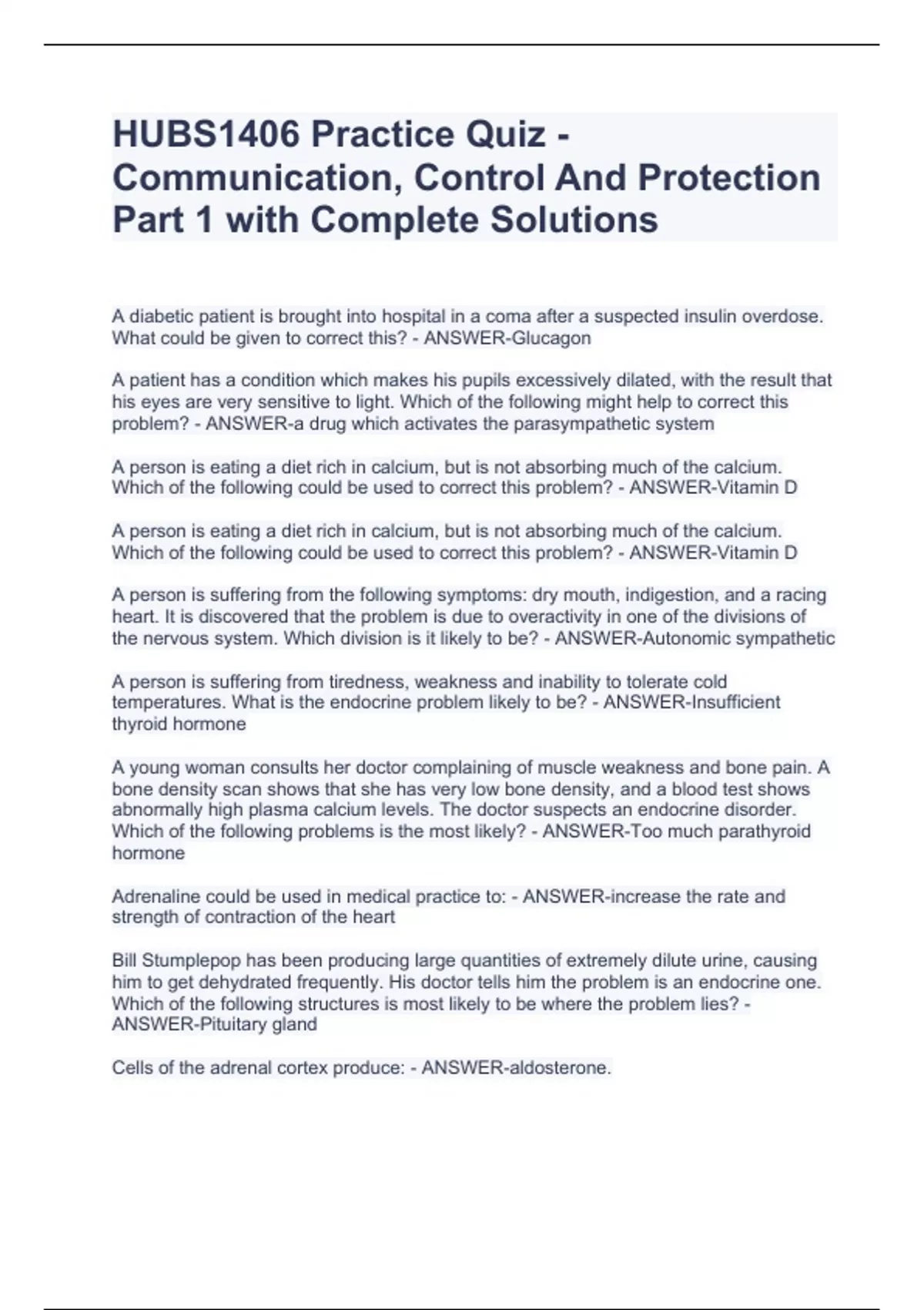 HUBS1406 Practice Quiz - Communication, Control And Protection Part 1 with Complete SolutionsHUBS1406 Practice QuizA diabetic patient is brought into hospital in a coma after a suspected insulin overdose. What could be given to correct this? - ANSWER-Glucagon A patient has a condition which makes his pupils excessively dilated, with the result that his eyes are very sensitive to light. Which of the following might help to correct this problem? - ANSWER-a drug which activates the parasympathetic system A person is eating a diet rich in calcium, but is not absorbing much of the calcium. Which of the following could be used to correct this problem? - ANSWER-Vitamin D - Communication, Control And Protection Part 1 with Complete SolutionsHUBS1406 Practice Quiz - Communication, Control And Protection Part 1 with Complete Solutions