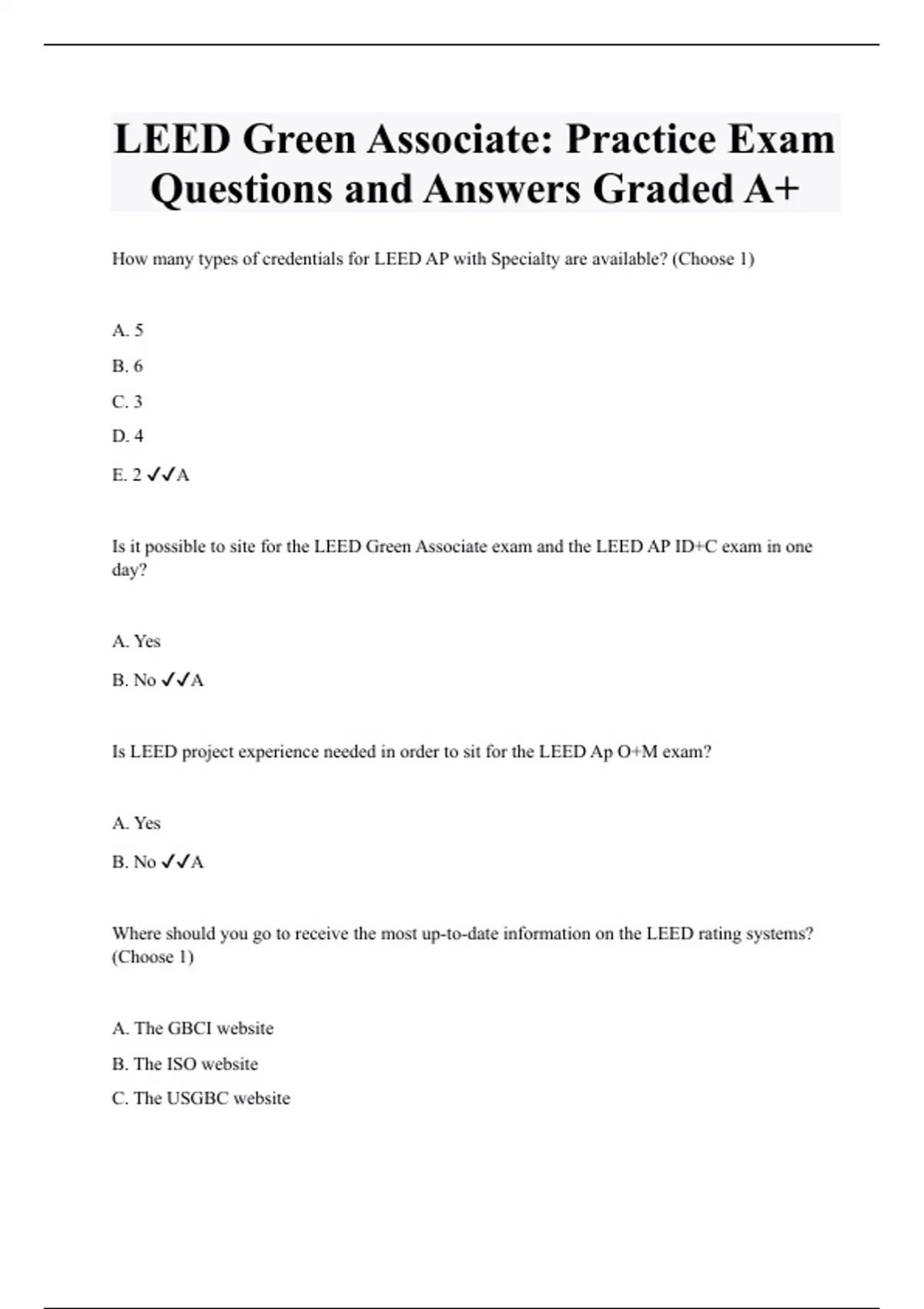 LEED Green Associate: Practice Exam Questions and Answers Graded A+ How many types of credentials for LEED AP with Specialty are available? (Choose 1) A. 5 B. 6 C. 3 D. 4 E. 2 A Is it possible to site for the LEED Green Associate exam and the LEED AP ID+C exam in one day? A. Yes B. No A Is LEED project experience needed in order to sit for the LEED Ap O+M exam? A. Yes B. No A Where should you go to receive the most up-to-date information on the LEED rating systems? (Choose 1) A. The GBCI website B. The ISO website C. The USGBC website